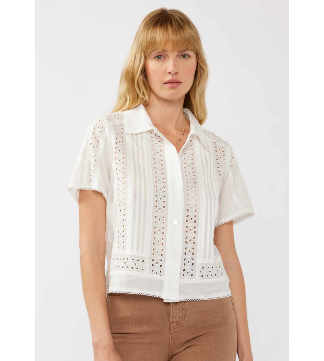 Stay cool and stylish with this floral eyelet short-sleeve shirt in soft cotton.