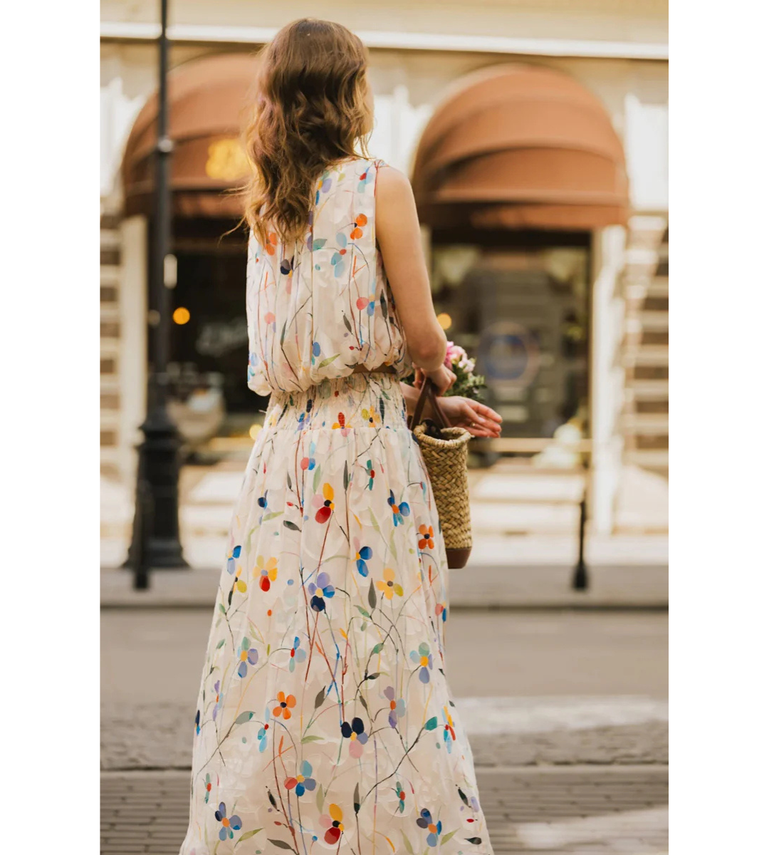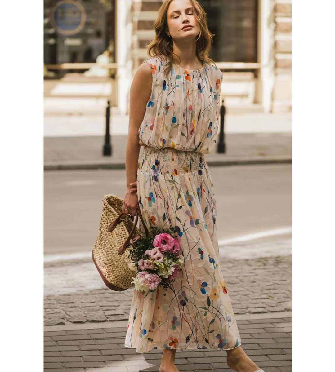 Falls sheer top in cream with delicate colourful floral print is a refined piece that effortlessly bridges casual and formal occasions. Featuring a flattering high neckline, crop length & it being sleeveless, it is designed for understated elegance. The elasticated waistband creates a gently gathered balloon silhouette that skims the body beautifully, offering both comfort and style.