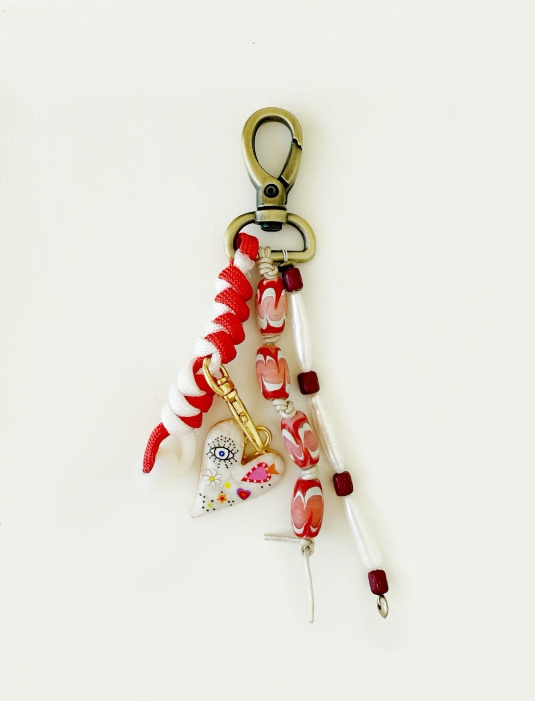A bold and stylish red and white bag charm designed to add a vibrant accent to any bag. Whether clipped to a purse, tote, or backpack, this charming accessory brings a playful pop of color and personality — the perfect finishing touch for everyday flair or seasonal cheer.