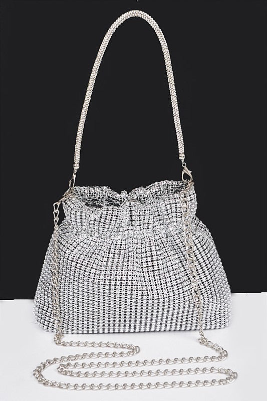 Make a dazzling statement with this glamorous rhinestone mesh shoulder bag, designed to turn heads at every event. Featuring an all-over crystal-embellished mesh body, this eye-catching bag sparkles under the light, adding a luxe touch to any evening ensemble. The slouchy drawstring design offers both style and practicality, while the dual strap options—a rhinestone handle and a long silver-tone chain—provide versatile carrying options. Whether worn over the shoulder or as a chic crossbody, this bag is the ultimate accessory for nights out, weddings, or special occasions.