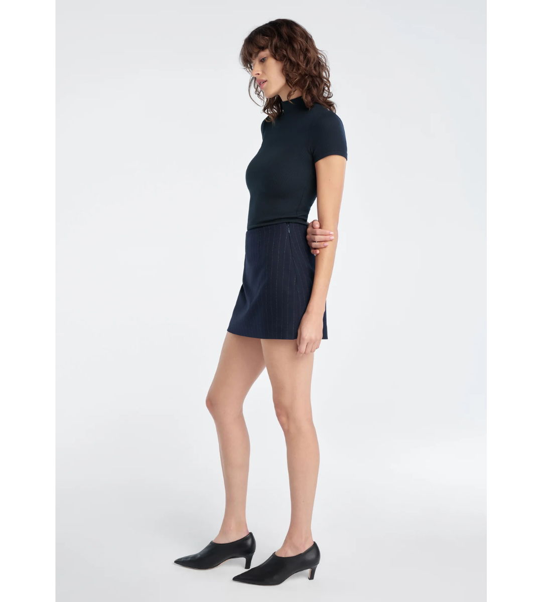 The Favorite Skort in Navy Pinstripe has an easy, elevated 11.5" waist that falls straight from hip to hem with built-in shorts. Measuring 13.75" from top to hem, it’s cut from a structured suiting blend.