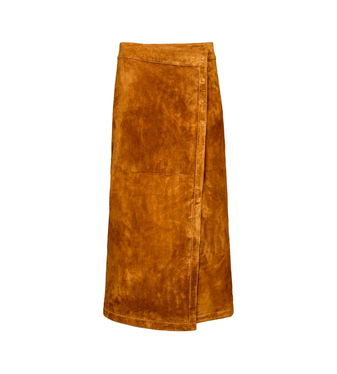 The Winona Skirt is a study in understated luxury. Crafted from supple suede in a rich nutmeg hue, it offers a soft hand feel and an indulgent texture that instantly elevates fall dressing. This fitted midi silhouette features a clean wrap design with a discreet snap closure for a modern, refined finish. Winona is the kind of investment piece that feels as good as it looks.