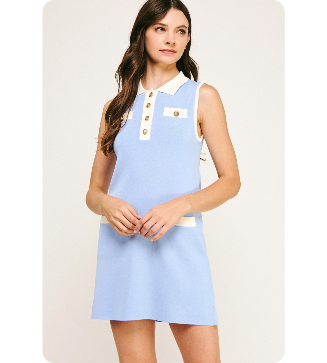 Fresh and feminine, the Audrey Dress in Peri Blue and Ivory brings a soft pop of color to a timeless polo-inspired silhouette. With its collared neckline, knit texture, and mini length, this color block style balances sporty charm with everyday elegance.