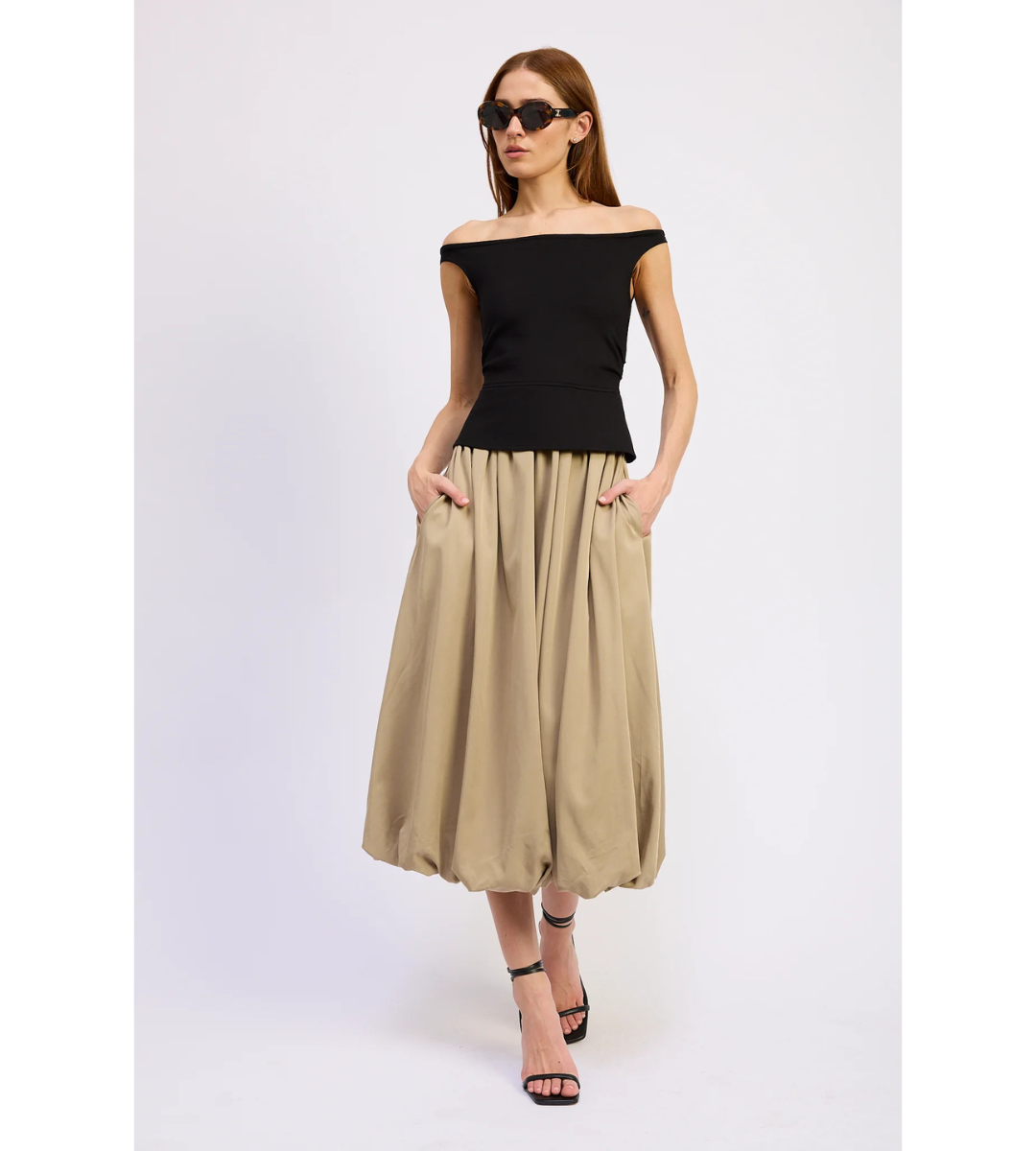 The Autumn Dress features an off shoulder bustier with attached bubble hem maxi skirt.