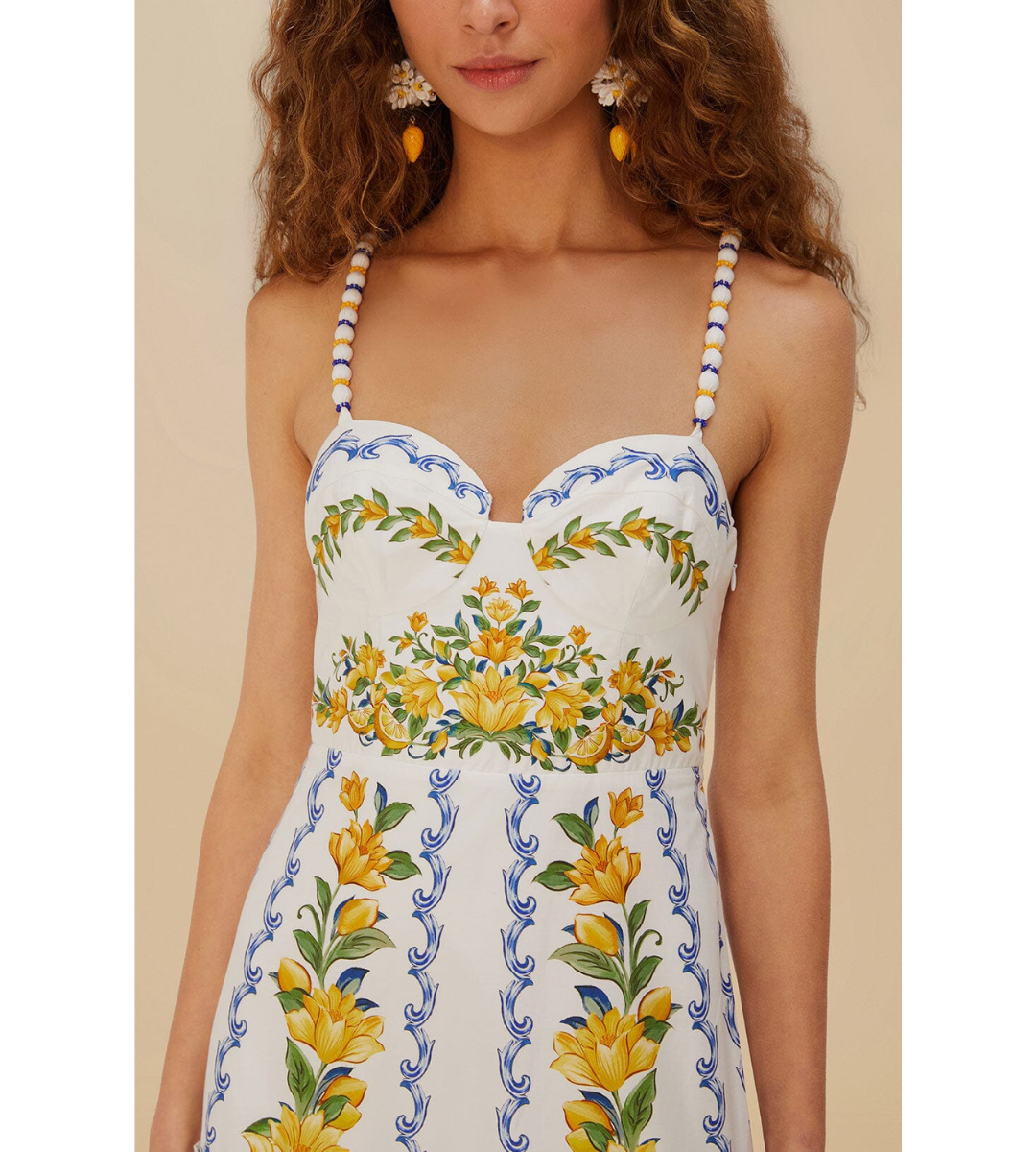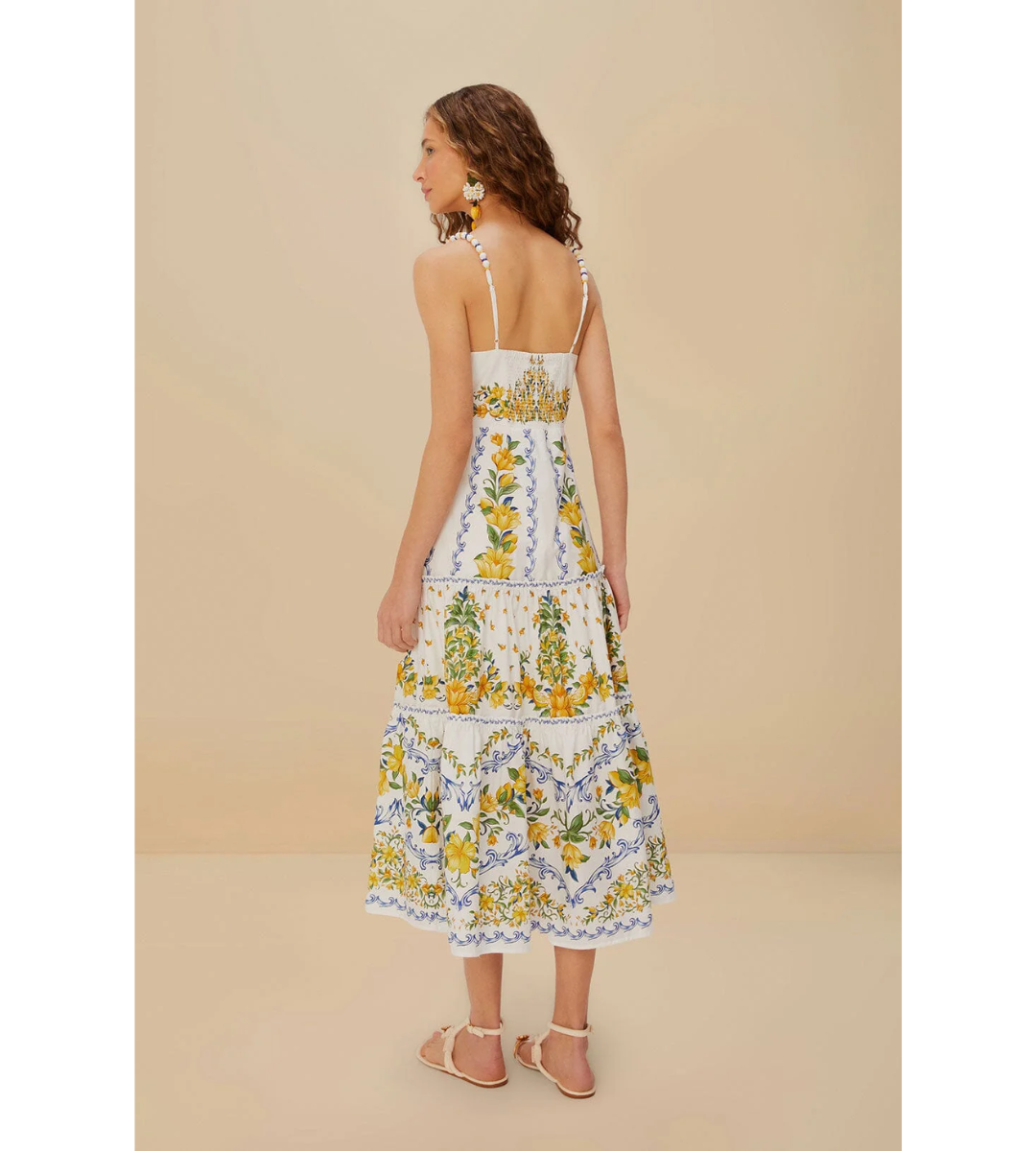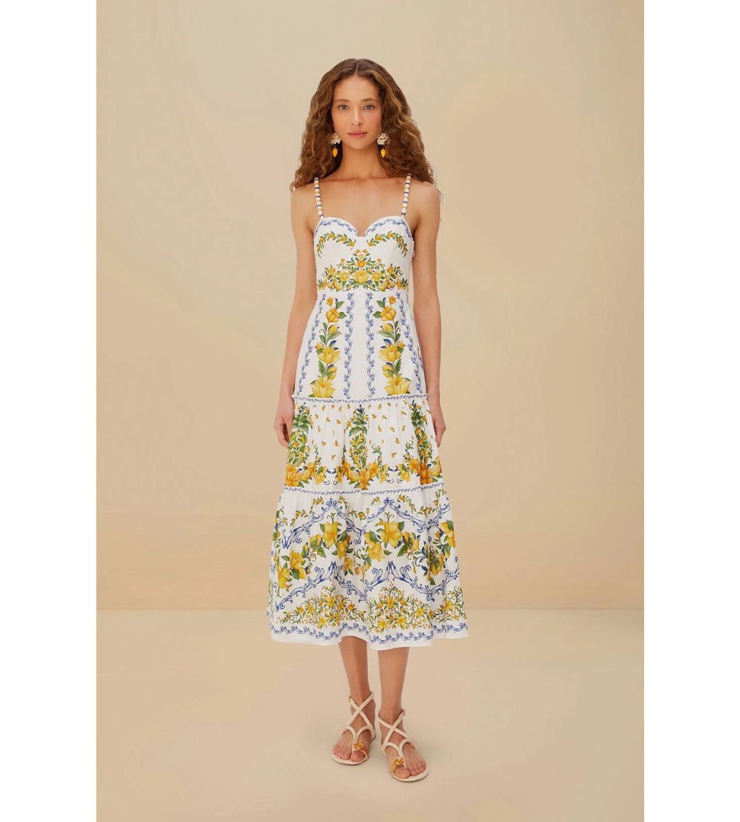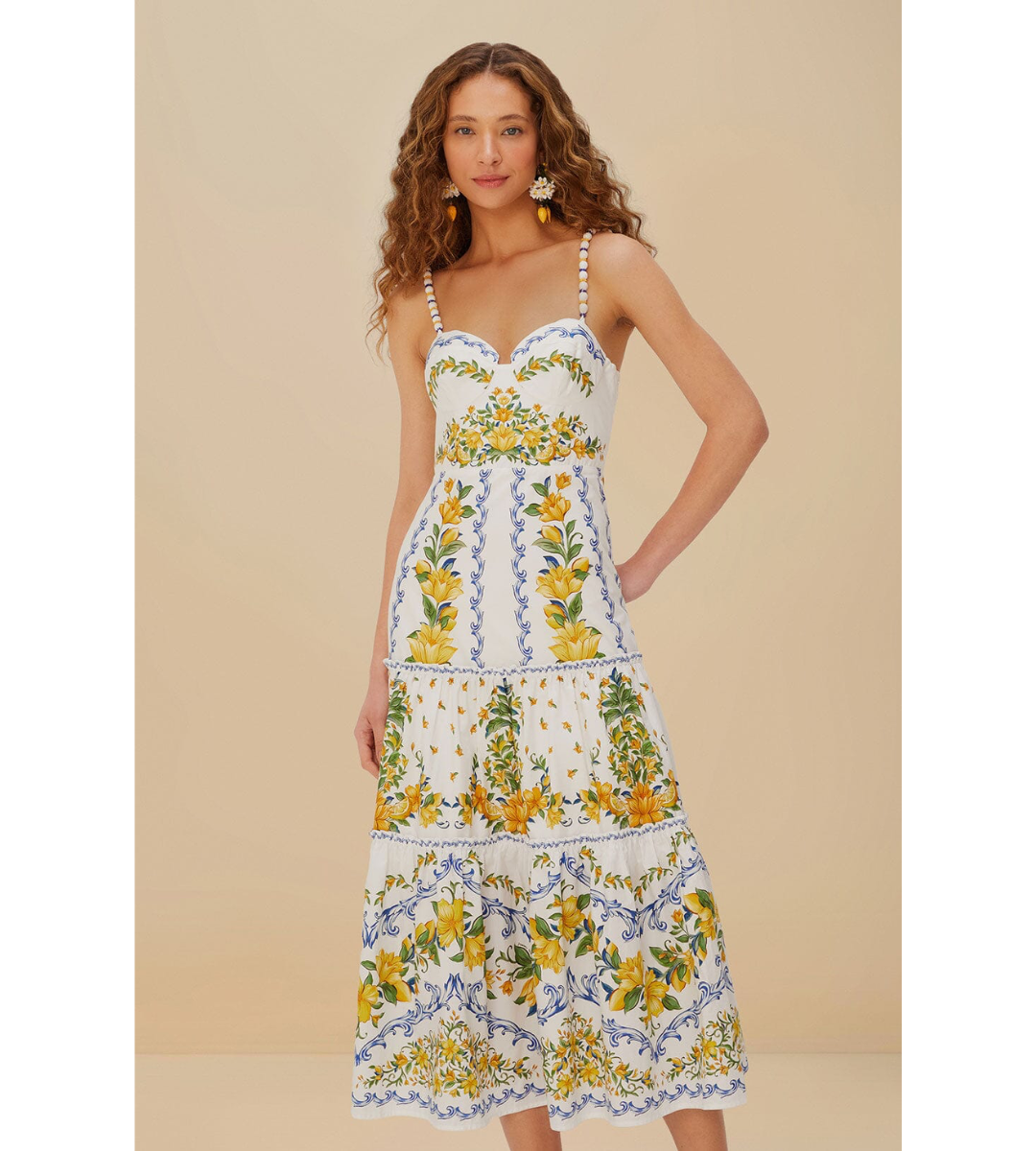 Embrace the essence of summer with the Off-White Sicily Organic Cotton Midi Dress. Crafted from responsible materials, this dress features a captivating sweetheart neckline and playful shoulder straps. The vibrant floral patterns in yellow and green dance across the fabric, evoking a joyful, dreamy vibe. Its flowing silhouette offers breezy elegance and timeless charm, perfect for sunlit days and star-filled evenings. Discover a piece that's both refreshing and enchanting.