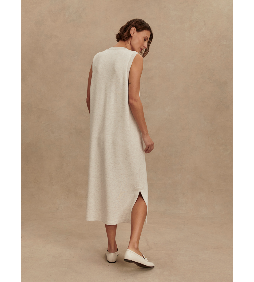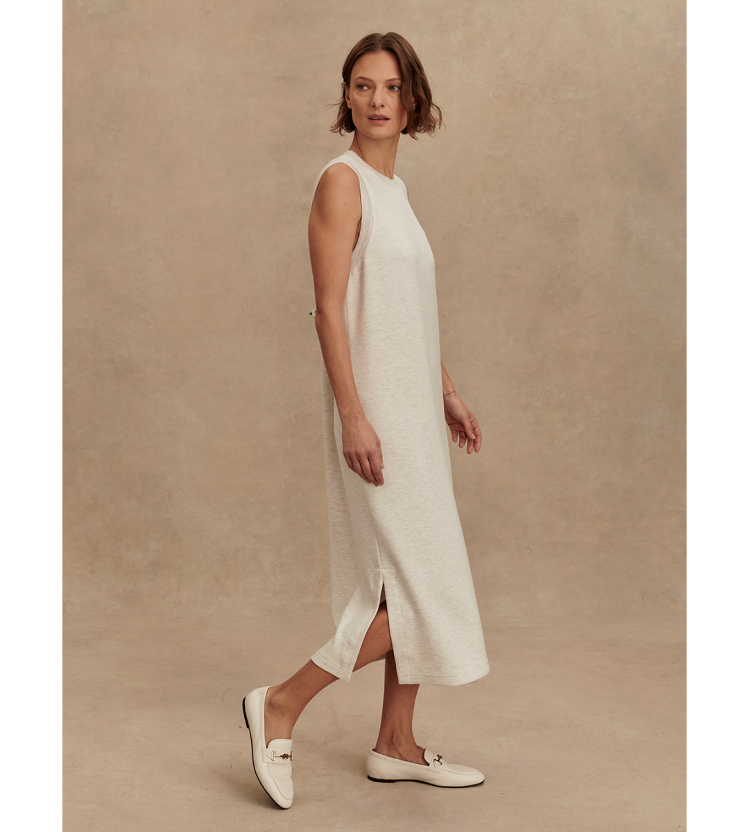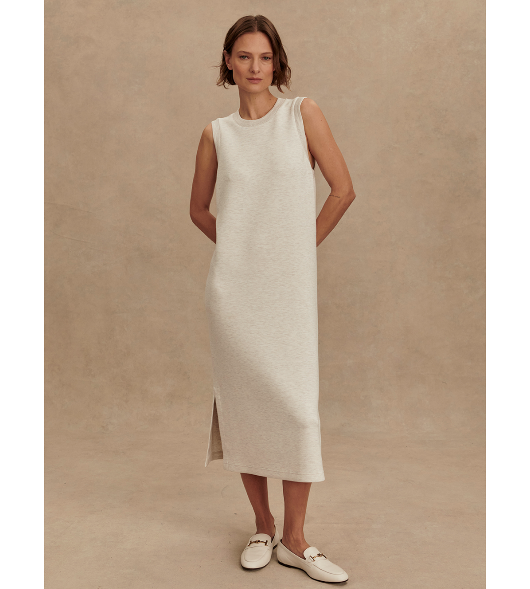 Effortless and elevated, the Beatrice Dress is a modern wardrobe essential. Crafted from a soft, structured knit in a neutral heathered tone, this sleeveless midi dress features a clean crew neckline, relaxed straight silhouette, and a subtle side slit for ease of movement. Minimalist in design, it offers endless styling potential—perfect for pairing with loafers for daytime polish or dressing up with a belt and heels for evening sophistication.