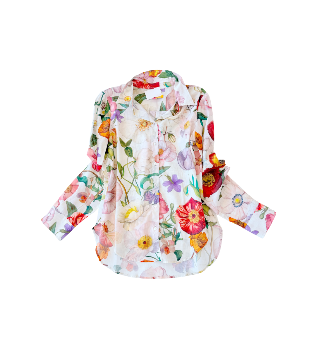 Light, airy, and beautifully detailed, this sheer floral blouse features a soft watercolor-inspired print with delicate blooms throughout. Designed with a relaxed fit, button-front closure, and subtle collar, it layers effortlessly or shines on its own. A romantic piece that adds an elegant pop to any outfit.