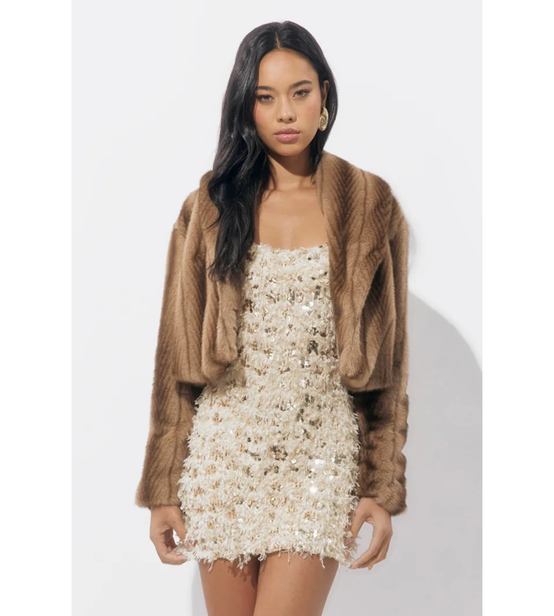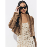 This coat is crafted from a soft, plush faux fur in a beautiful shade of brown. It features a relaxed, cropped silhouette with a classic collar and a full button-up front. The coat's plush texture and rich color make it a cozy and elegant statement piece for any occasion.