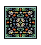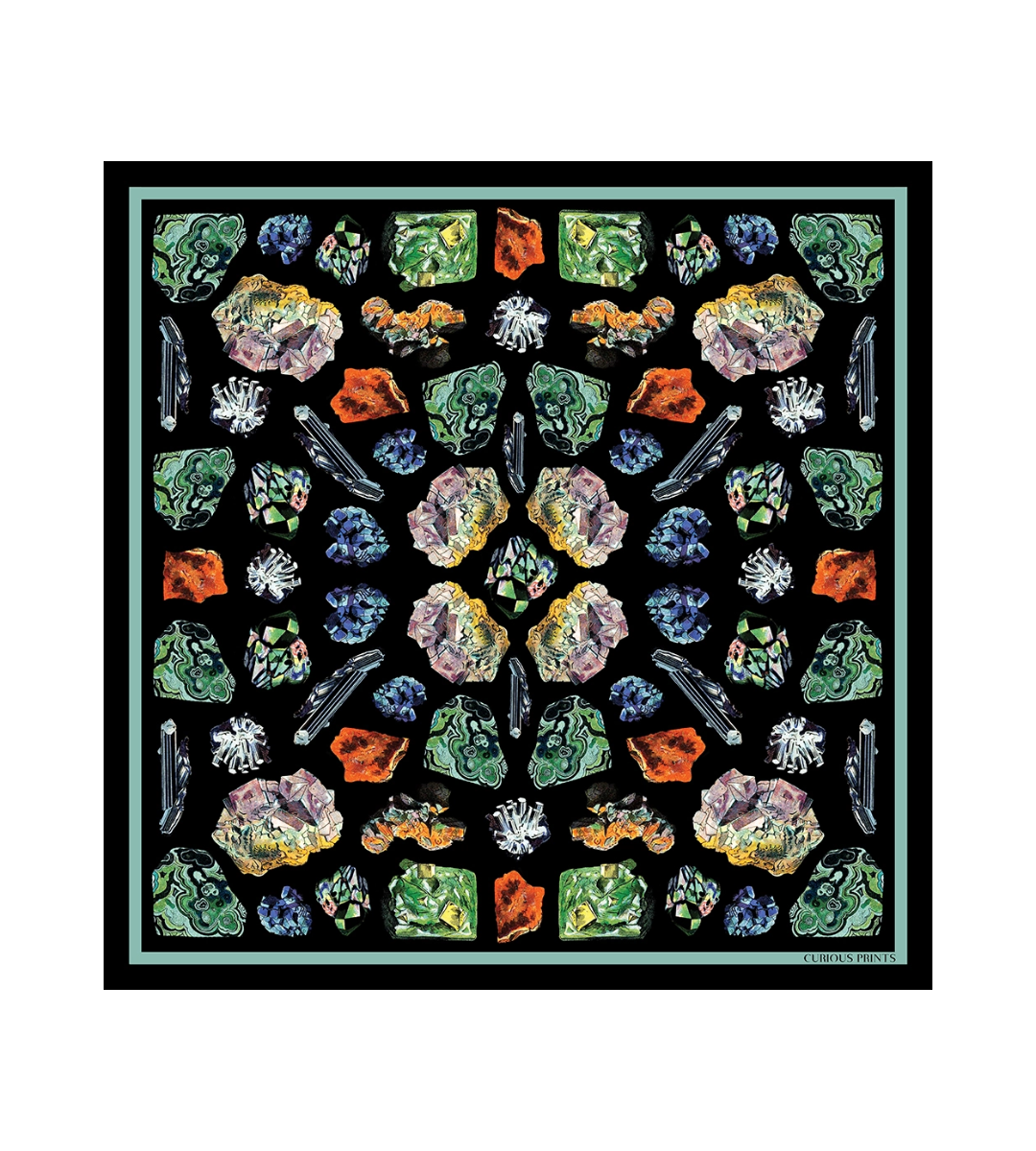 A striking accessory with a touch of glamour, this black silk scarf is adorned with vibrant, jewel-toned gemstone prints.