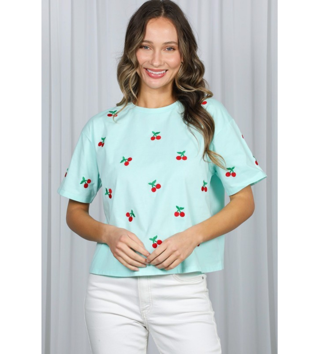 Sweeten up your style with the Adeline Top in Mint. This soft short sleeve tee features adorable cherry embroidery that pops against the fresh mint hue. Playful yet polished, it’s perfect for sunny days, casual outings, or adding a fun twist to your everyday look.