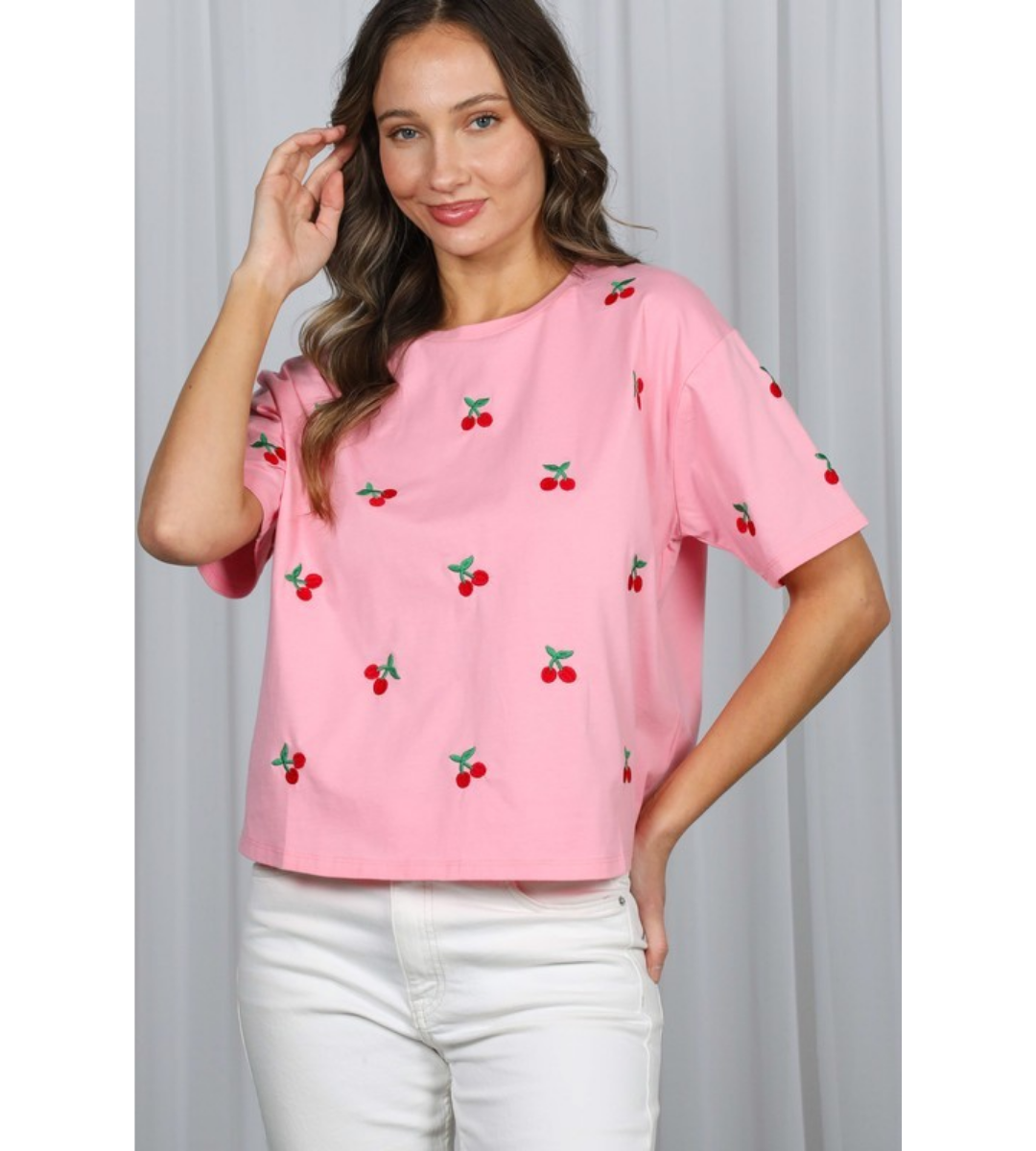 The Adeline Top in Pink brings a cheerful vibe to your wardrobe with its soft hue and whimsical cherry embroidery. This short sleeve top is the perfect mix of cute and casual—ideal for brunch dates, weekend strolls, or anytime you want a sweet, standout look.