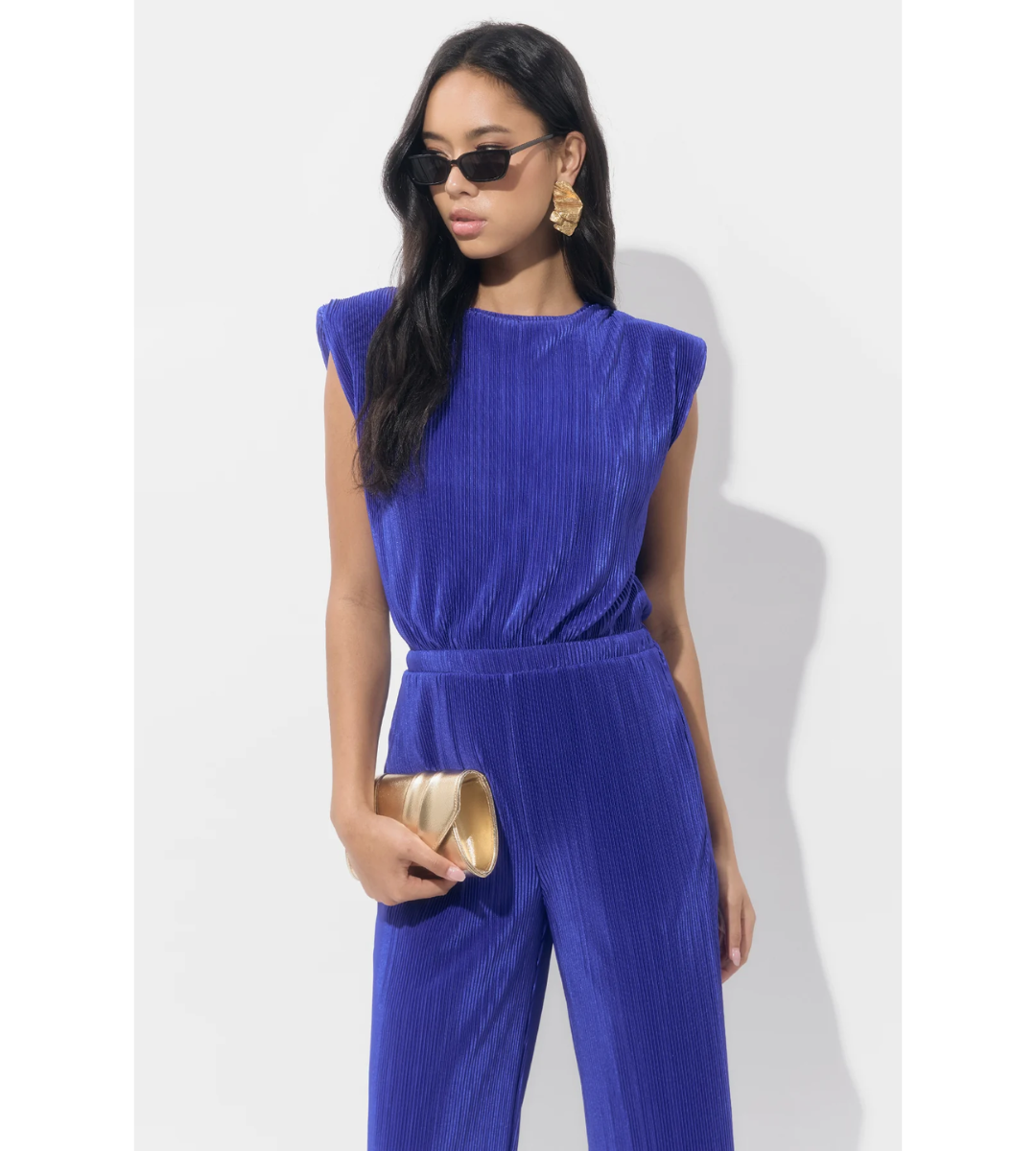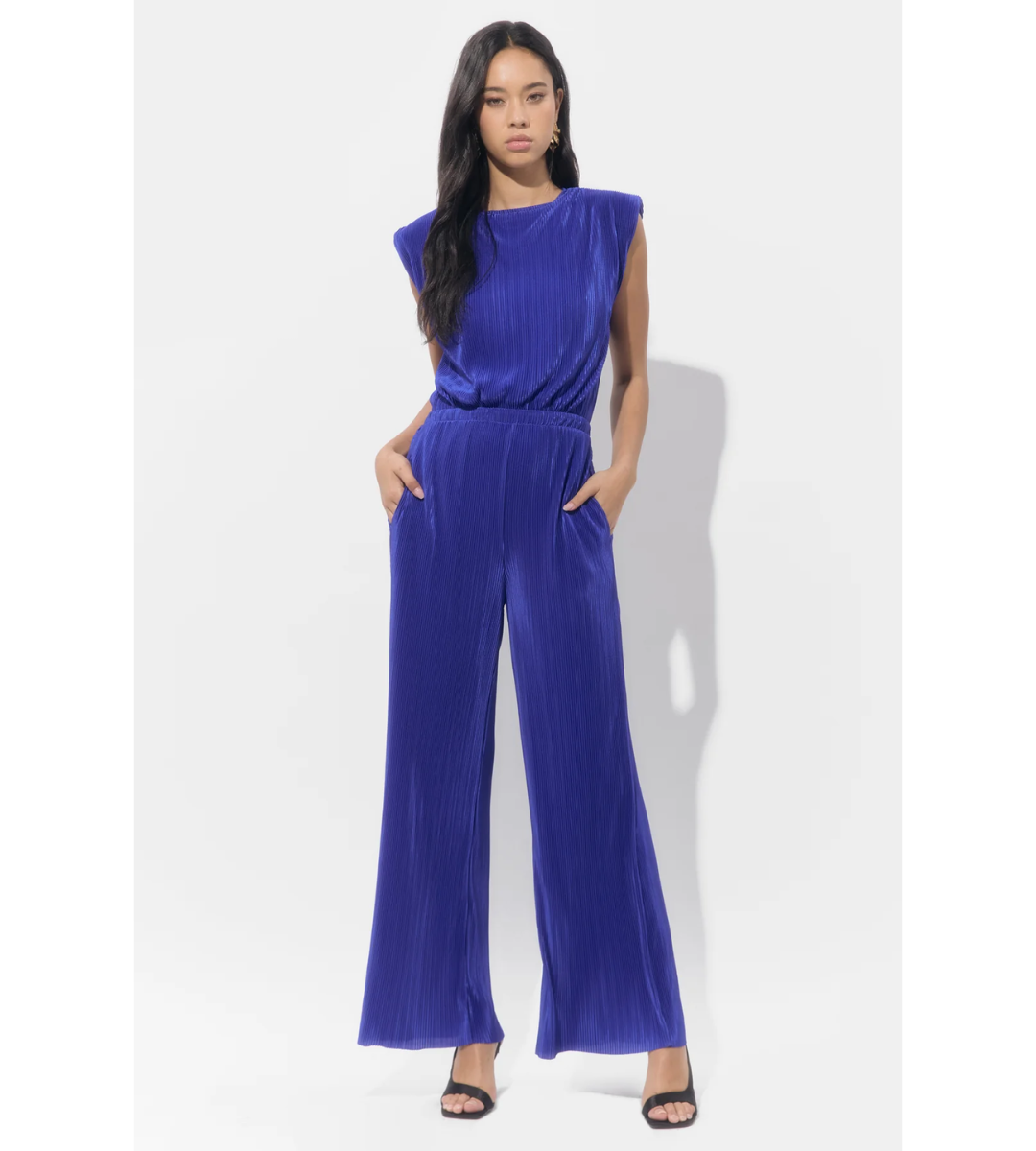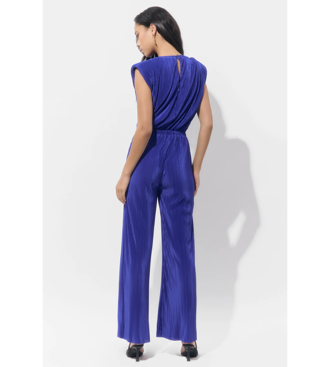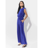 This jumpsuit utilizes plissé fabric—a finely pleated material—that offers texture and beautiful movement throughout the silhouette.