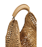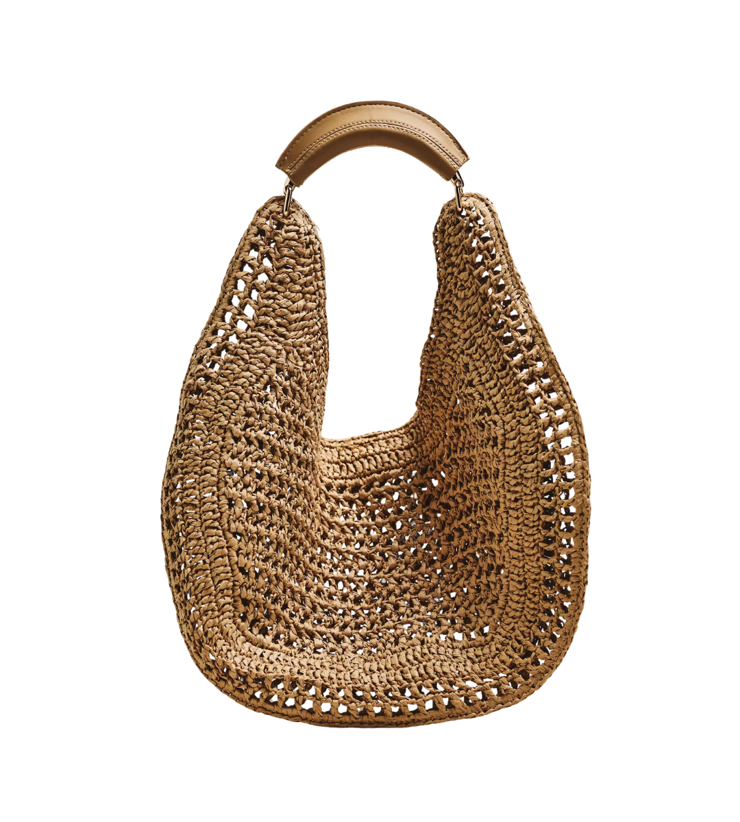 Open-weave body, roomy lined interior, lightweight slouch for effortless shoulder or hand carry. Statement metal arch handle, subtle hardware, versatile day-to-night styling.