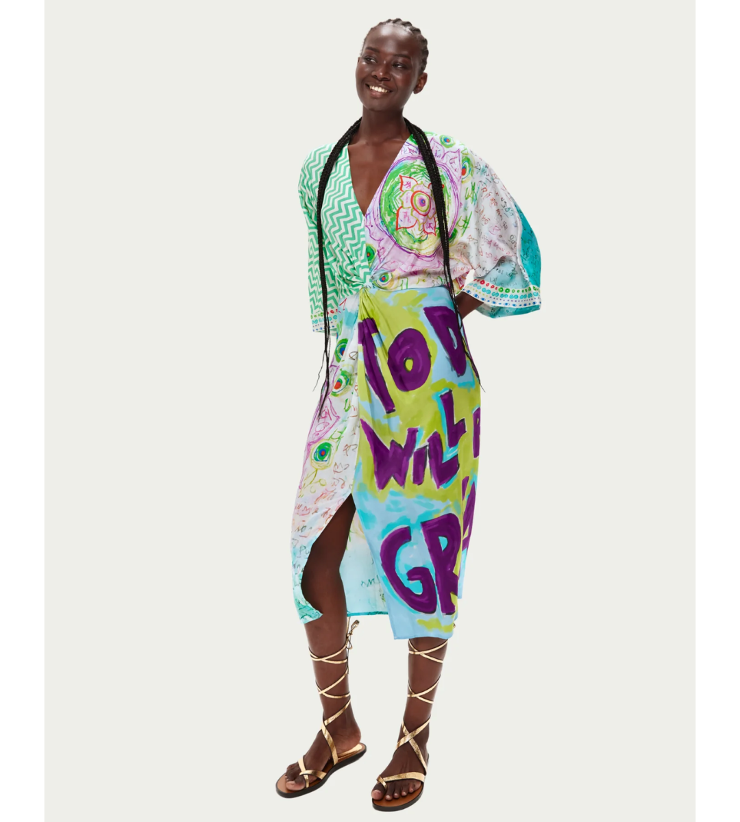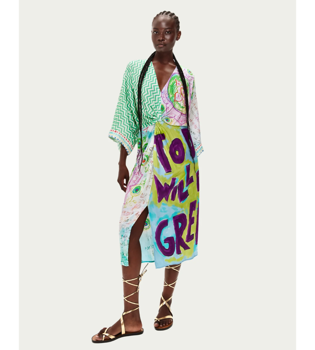 Flow with the energy of the universe in the Camila kimono dress. Featuring vibrant mandalas, energy wheels, and empowering typography in spiritual greens, purples, and turquoise hues.
