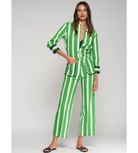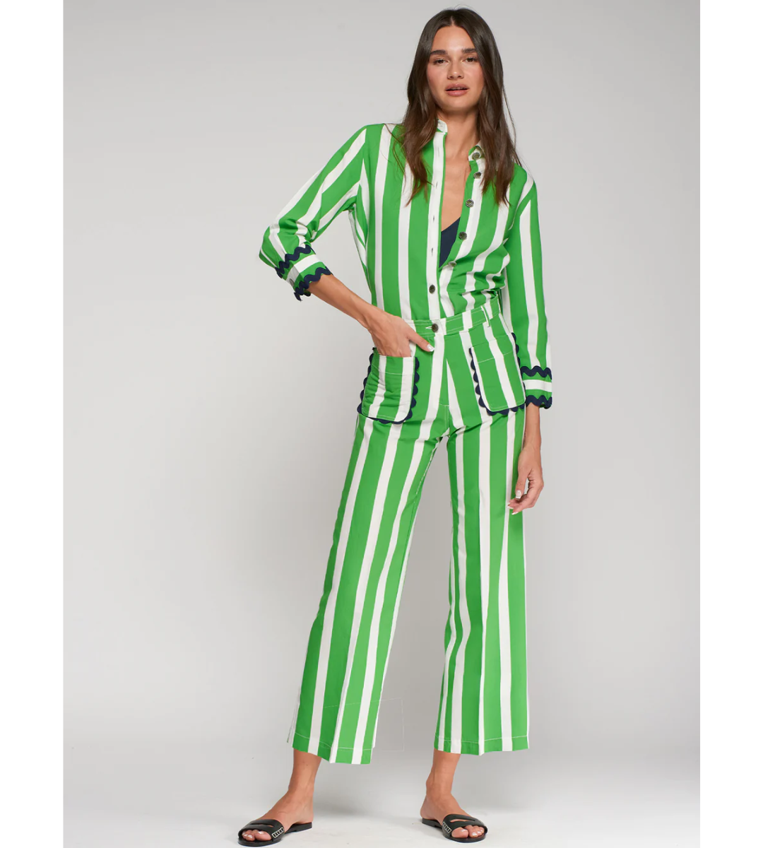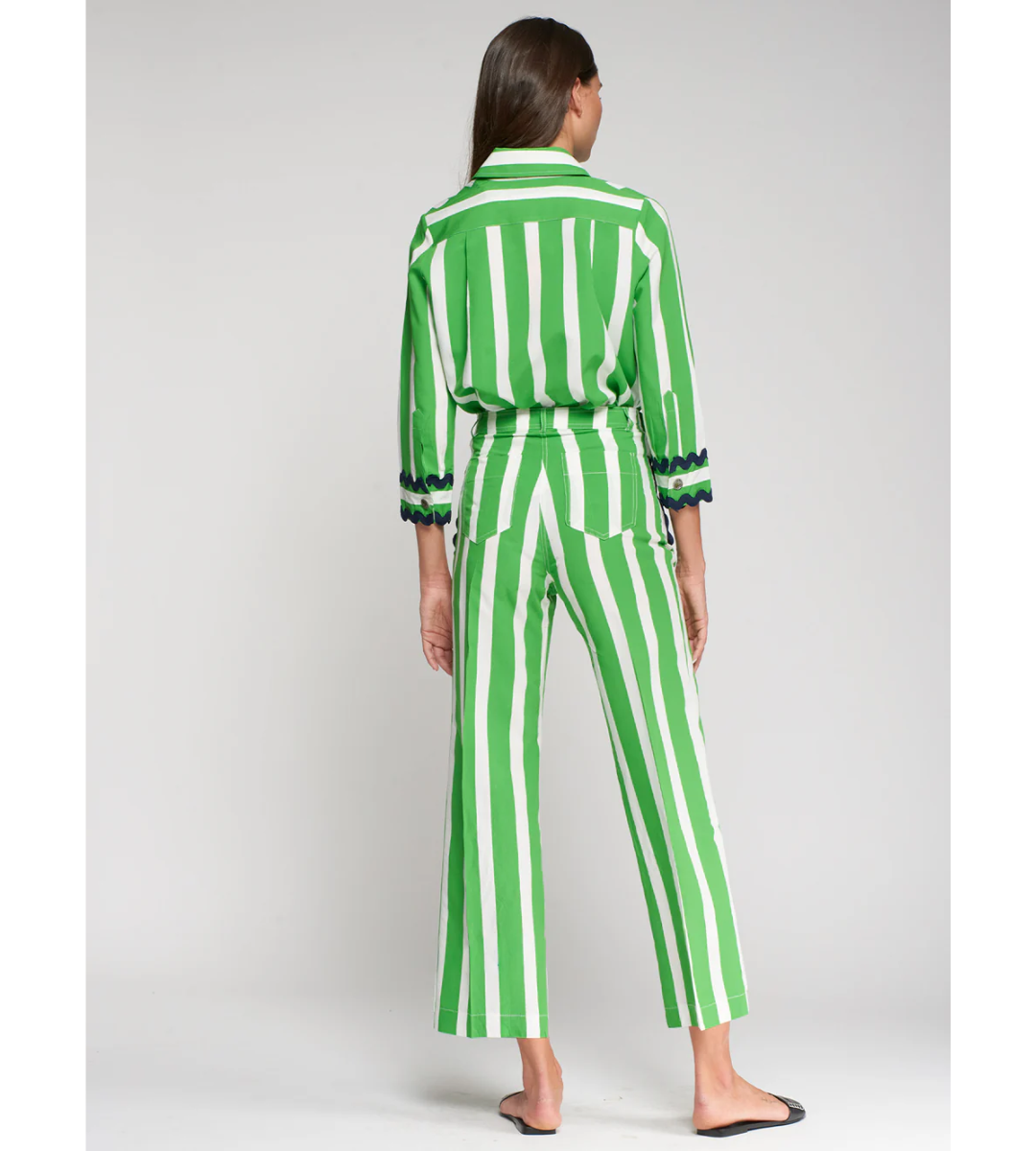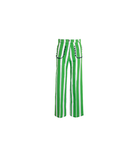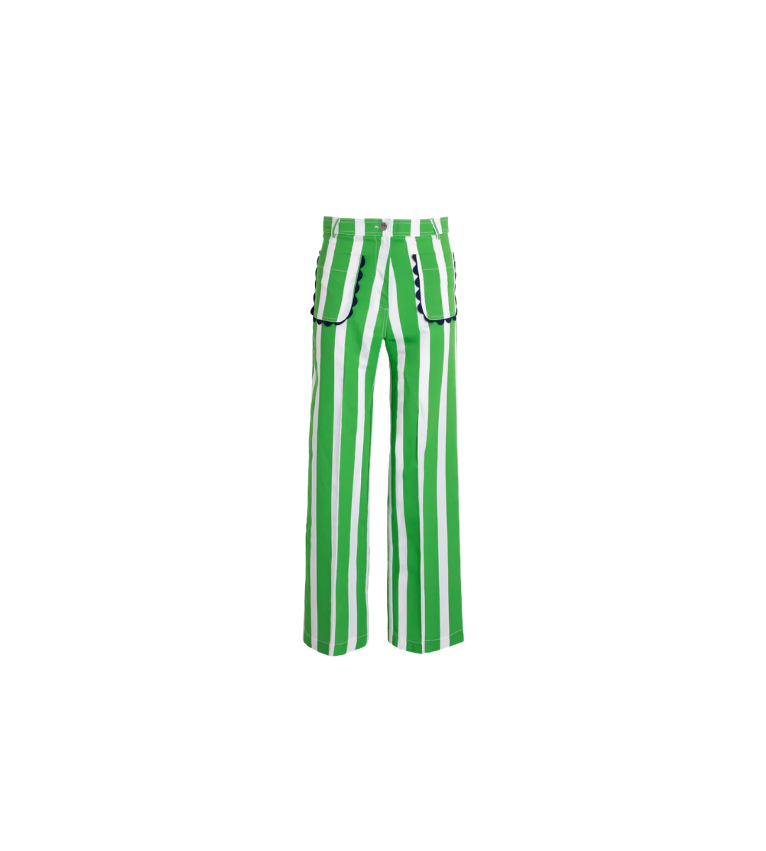 Green and white vertical striped trousers. Straight cut with front pockets finished with contrasting navy blue piping. Waistband with belt loops and front button and zip fastening.