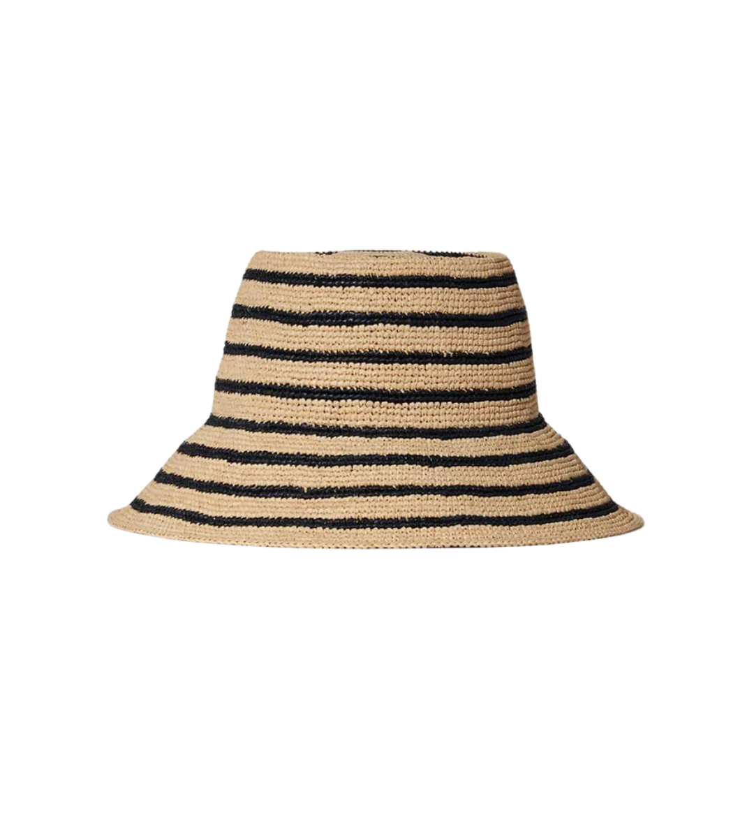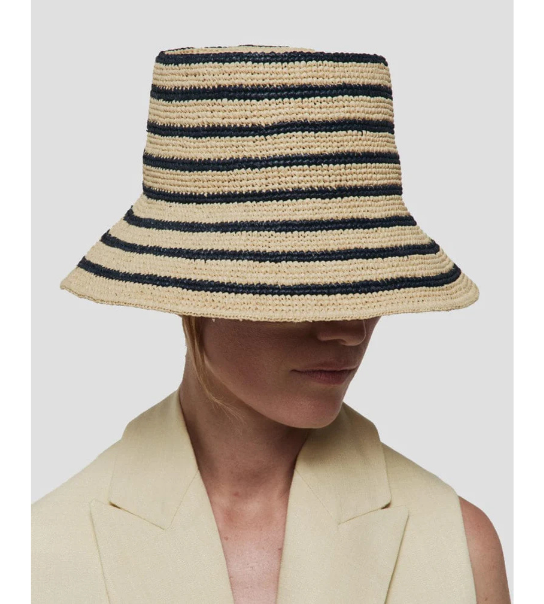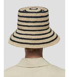 A modern interpretation of our classic raffia bucket, Felix is hand-crocheted in Madagascar from natural raffia straw. The short brim is finished with a discreet malleable wire, allowing the shape to be subtly refined while maintaining its composed structure. Lightweight and packable, it folds with ease and returns to form. Layered navy striping introduces a rhythmic contrast across the warm, natural weave.