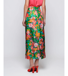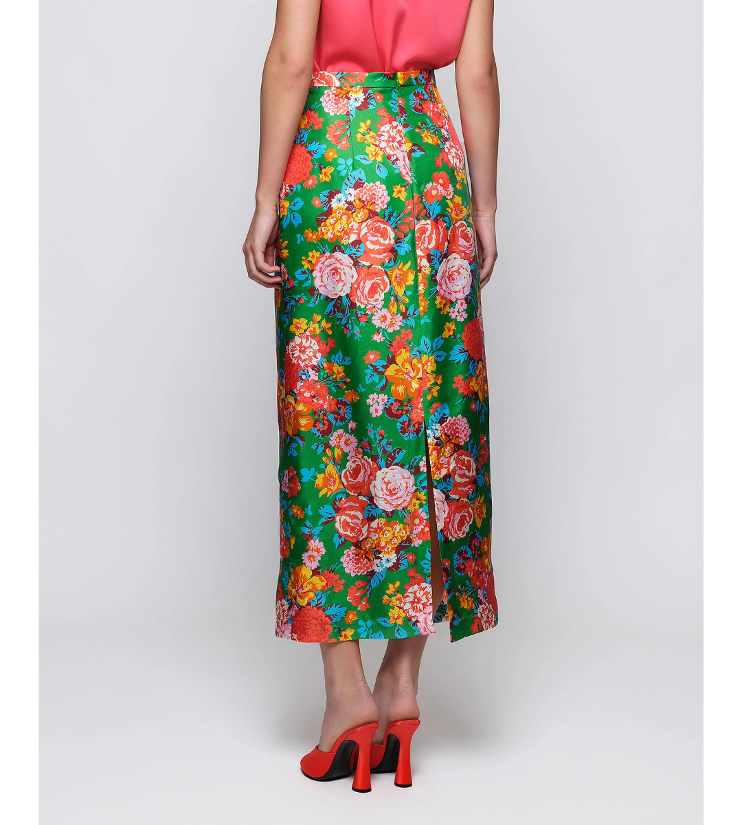 Bold, vibrant, and unapologetically feminine. This high-waisted midi skirt features a rich floral print set against a striking green backdrop, creating a true statement piece. The structured silhouette skims the body with a clean, flattering line, while the smooth fabric gives it a polished, elevated feel.