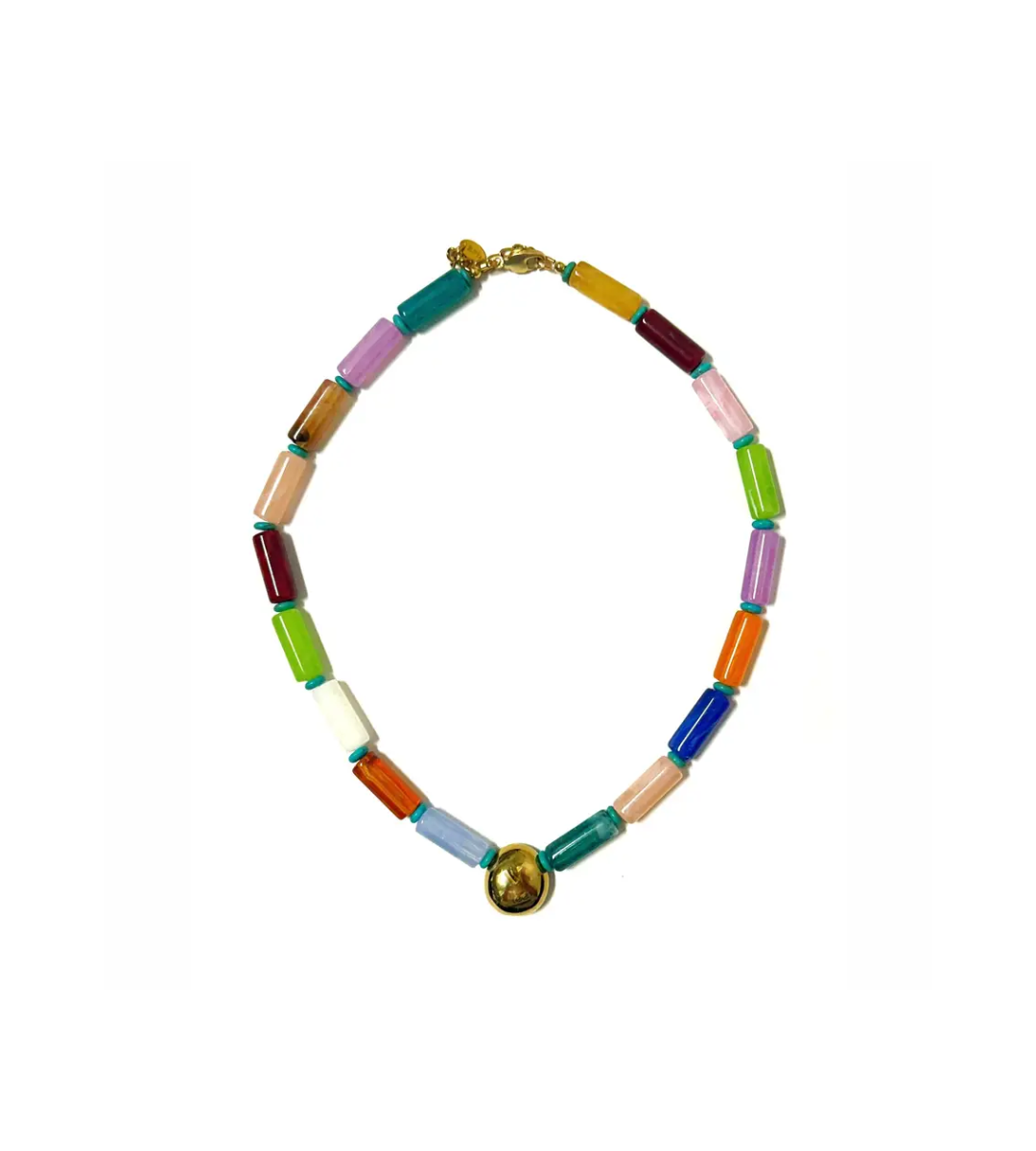 Make a bold statement with this vibrant, multi-colored pillar bead necklace.