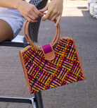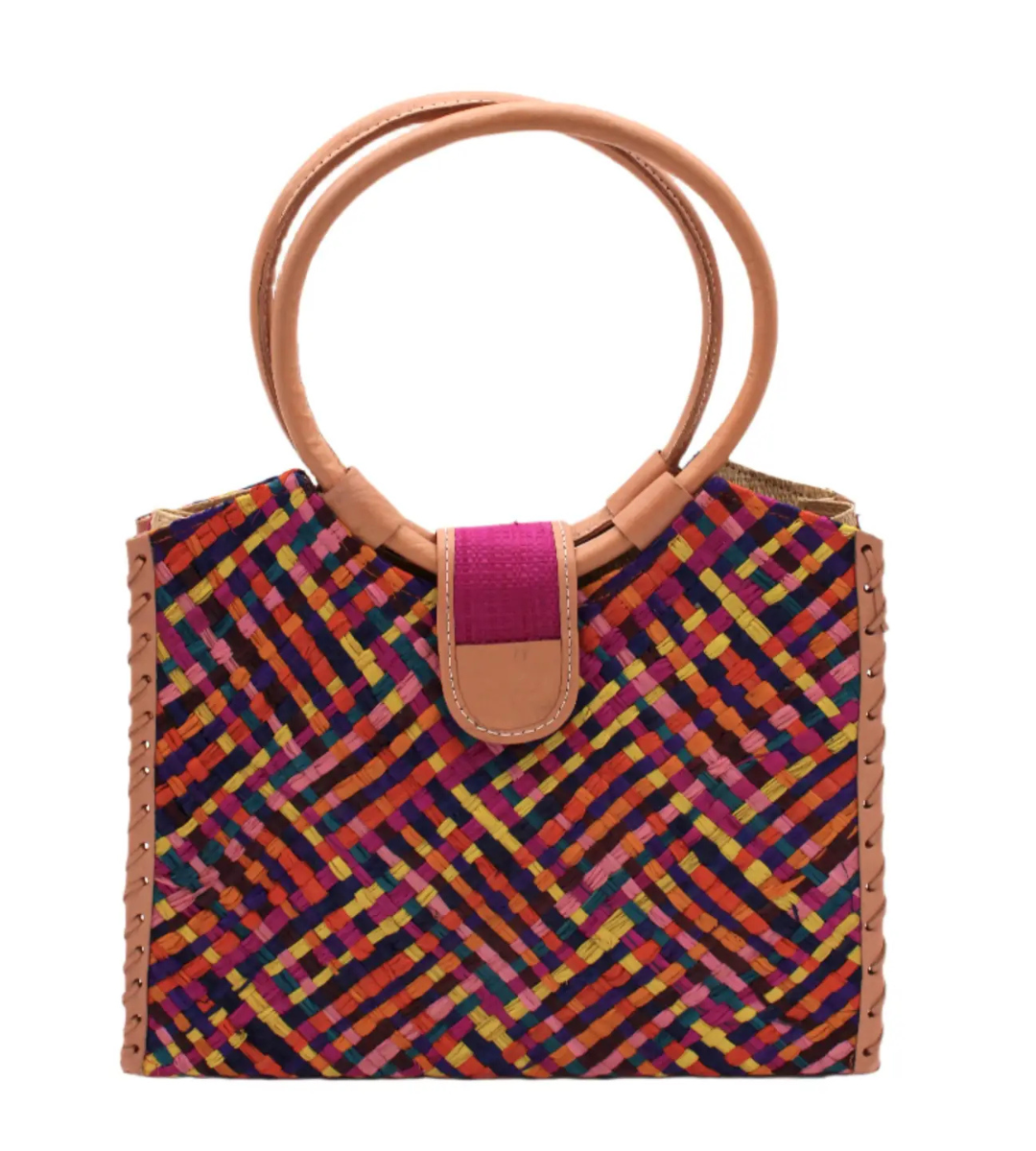 Hand-dyed woven raffia handbag featuring leather handles and a magnetic flap closure