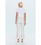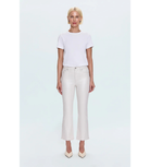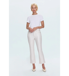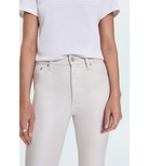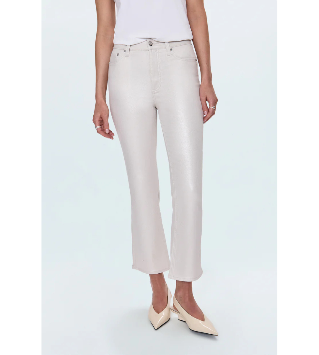 A modern take on the classic bootcut, Lennon features a high rise and slim fit through the hips and thighs before subtly flaring at the calf for balanced proportion. The cropped 27" inseam flatters every shoe, from heels to flats. Crafted from high-stretch fabric in Ivory Luster, a pearly off-white with a sleek coated finish that adds soft sheen and elevated polish.