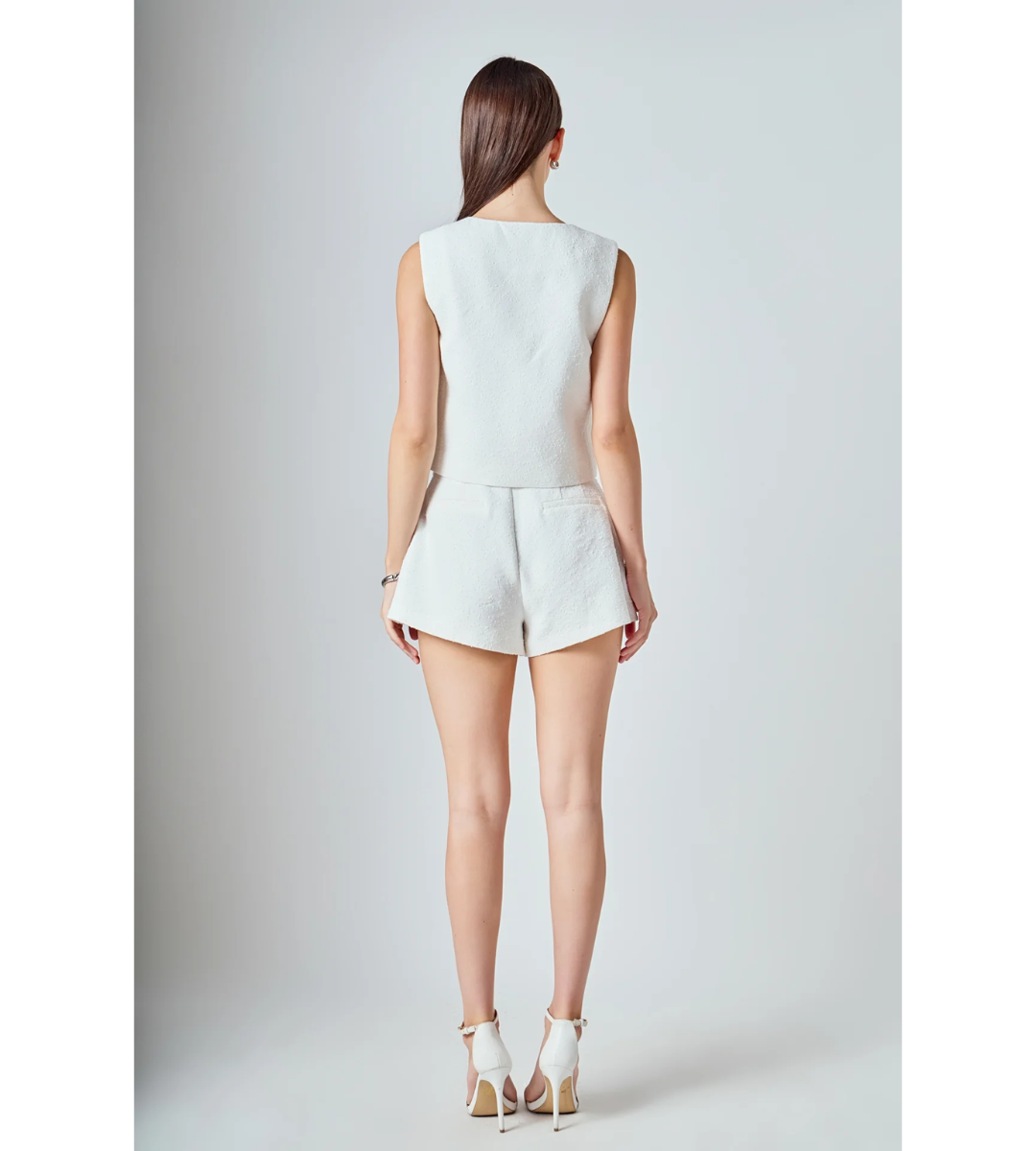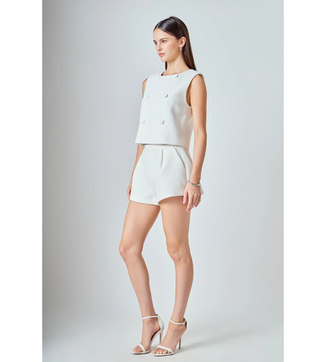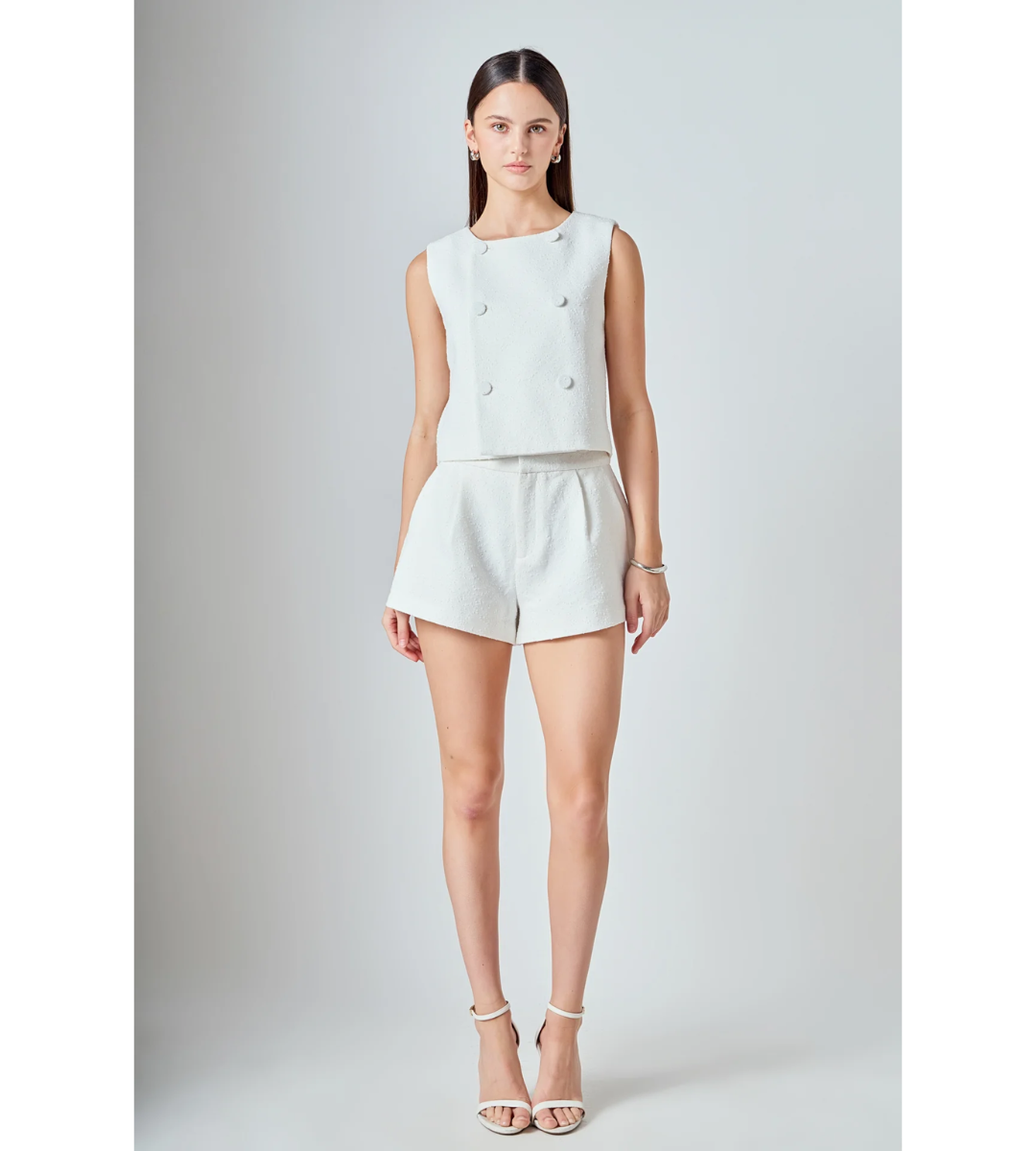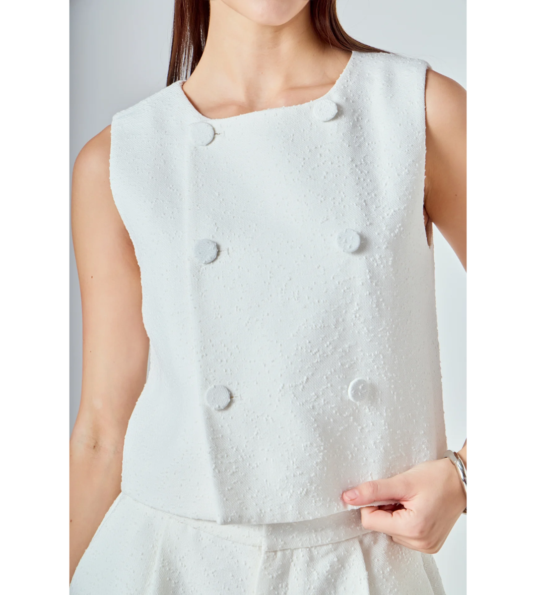 The perfect combination of style and comfort. Featuring a double-breasted design and a cropped length, this vest adds a touch of sophistication to any outfit. Made from high-quality textured fabric, it provides a unique and trendy look. The versatile design allows for easy layering and the perfect fit. Whether paired with high-waisted jeans or a flowy skirt, this vest will elevate your wardrobe. Stand out from the crowd and make a statement with our Double Breasted Textured Crop Vest.