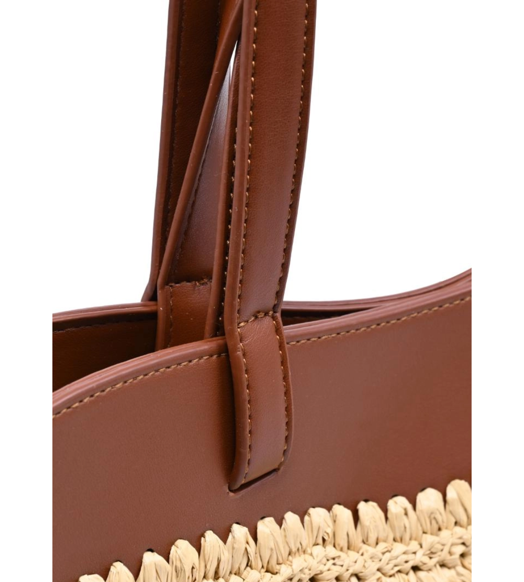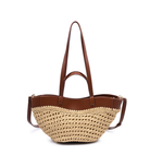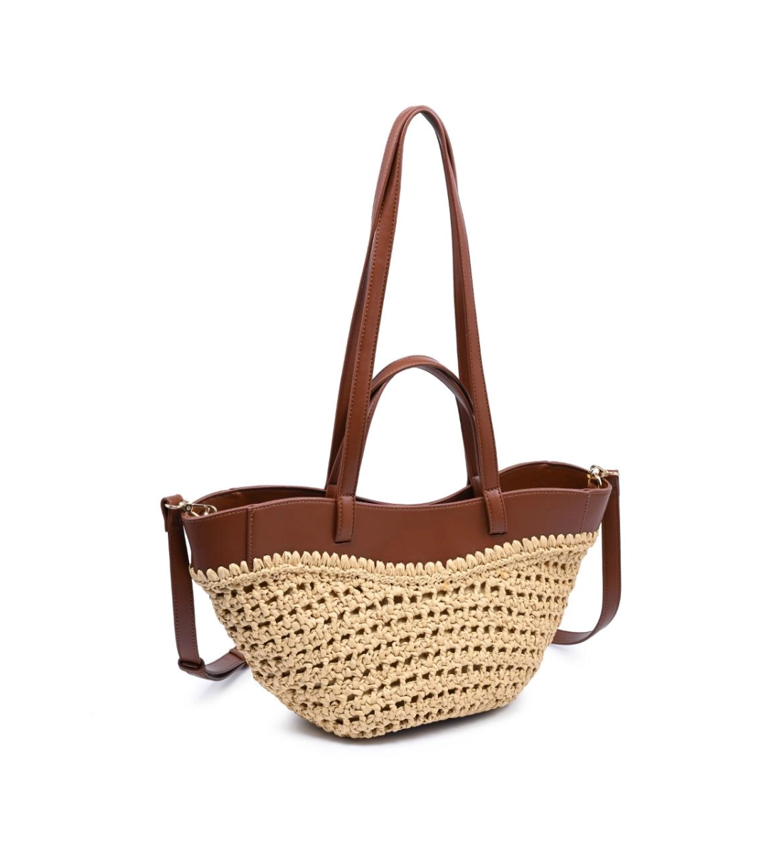 Woven body paired with a smooth top band, dual short handles and a long adjustable strap for hand, shoulder or crossbody wear. Gold-tone hardware adds polish. Spacious silhouette holds essentials with effortless, chic appeal. Ideal for city errands, weekend plans, or warm-weather outfits. A versatile tote that blends trend-aware design and everyday function—perfect for updating your bag rotation.