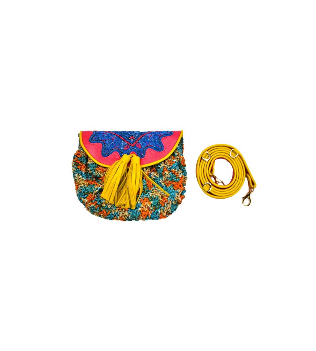 A beautifully handcrafted mini bag in soft leather, adorned with unique embroidery and playful fringe details. Designed for versatility, this lightweight bag can be worn in three ways—style it as a belt bag, wear it crossbody with its adjustable strap, or carry it as a chic shoulder bag. Each piece is hand-embroidered by skilled women artisans, bringing generations of craftsmanship to every stitch.