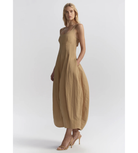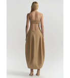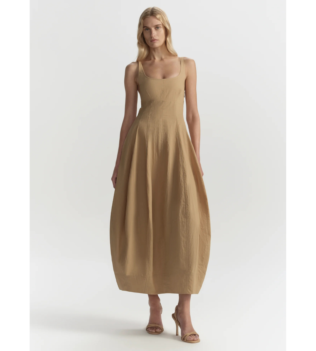 The Nina Dress is crafted from washed cotton-nylon with a soft, lightweight feel that holds its shape in a warm sand hue. This midi silhouette features a square neckline, adjustable straps, and a smocked back panel, while seaming through the bodice enhances the shape and releases into a voluminous, sculpted skirt.