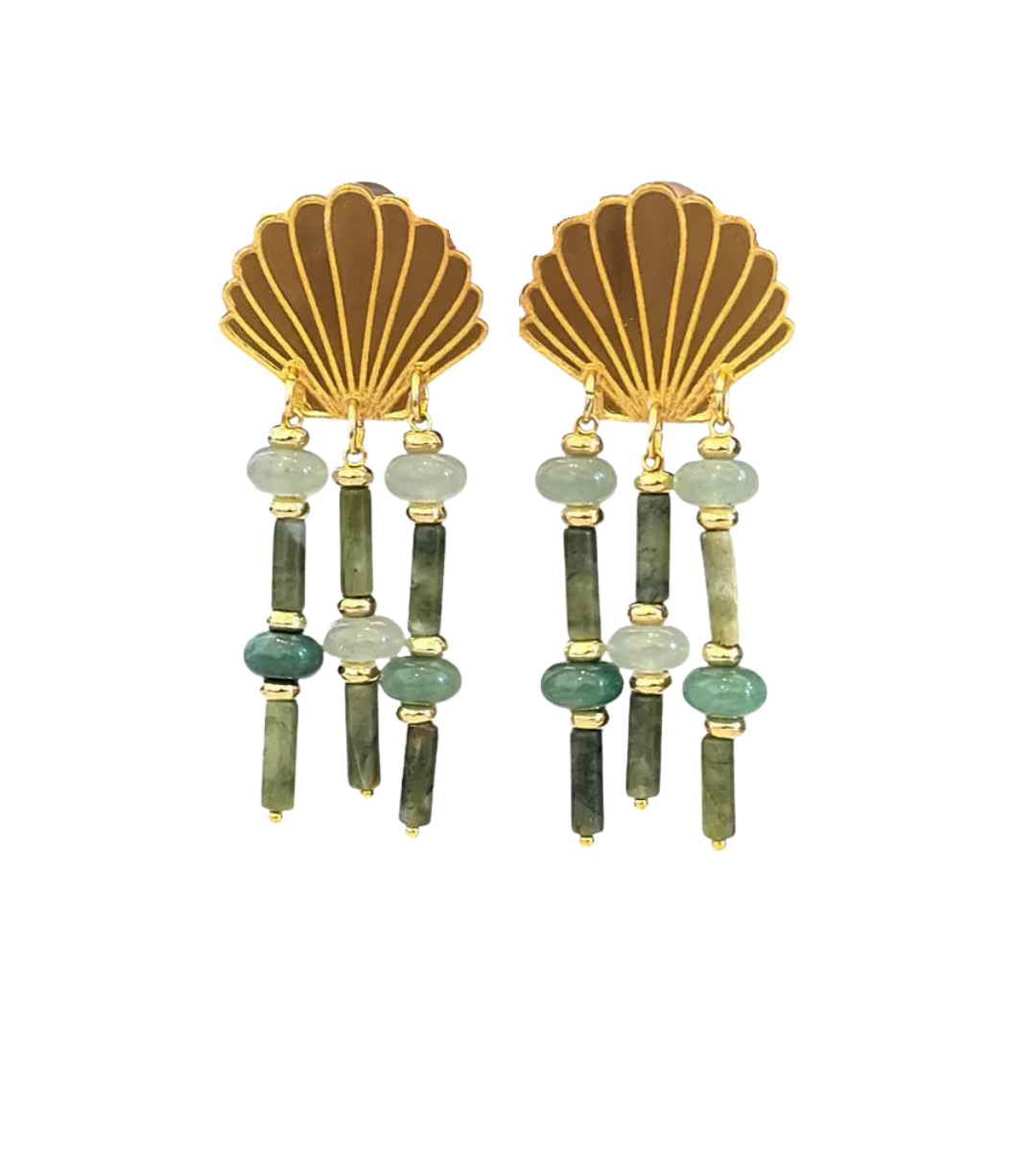 Introducing the Ophelia Seashell Statement Earrings — a striking design from our beloved Coastal Heirloom Collection. Inspired by timeless seaside treasures, these earrings feature a polished gold seashell stud that feels both vintage and elevated, accented with a fringe-like cascade of natural gemstone beads that move beautifully with you. Each pair is crafted using natural quartz and hand-selected green gemstone beads, finished with polished gold accents for a refined glow. The gemstones range in unique shades of soft sage to deep sea green, meaning no two pairs are ever exactly alike — every set is one-of-a-kind, just like the woman wearing them.