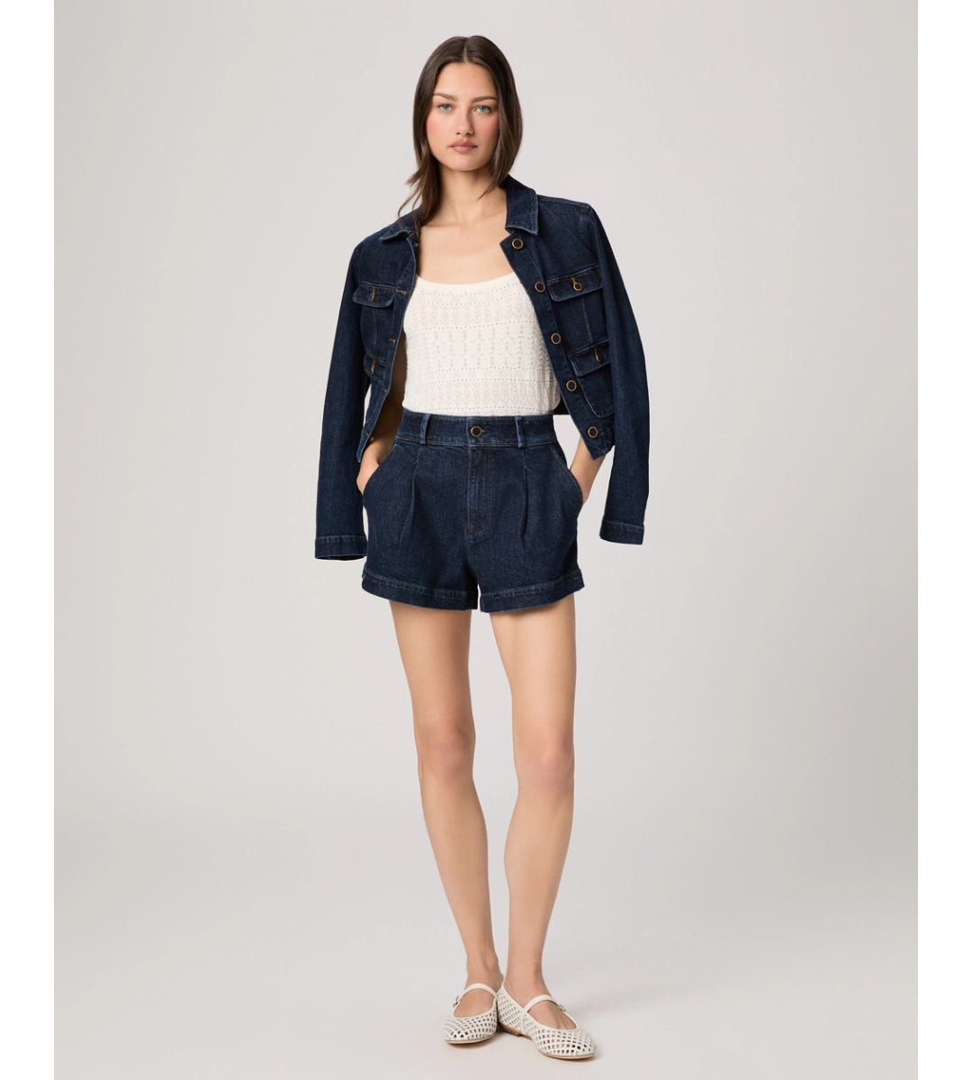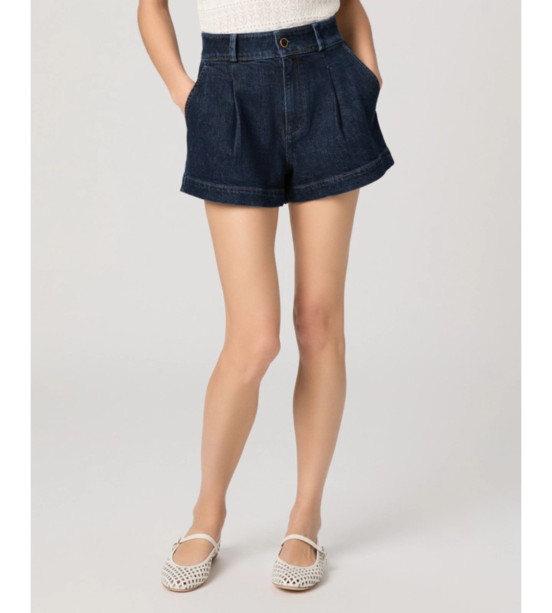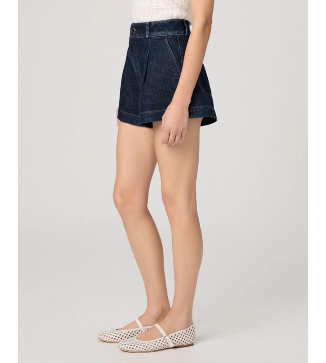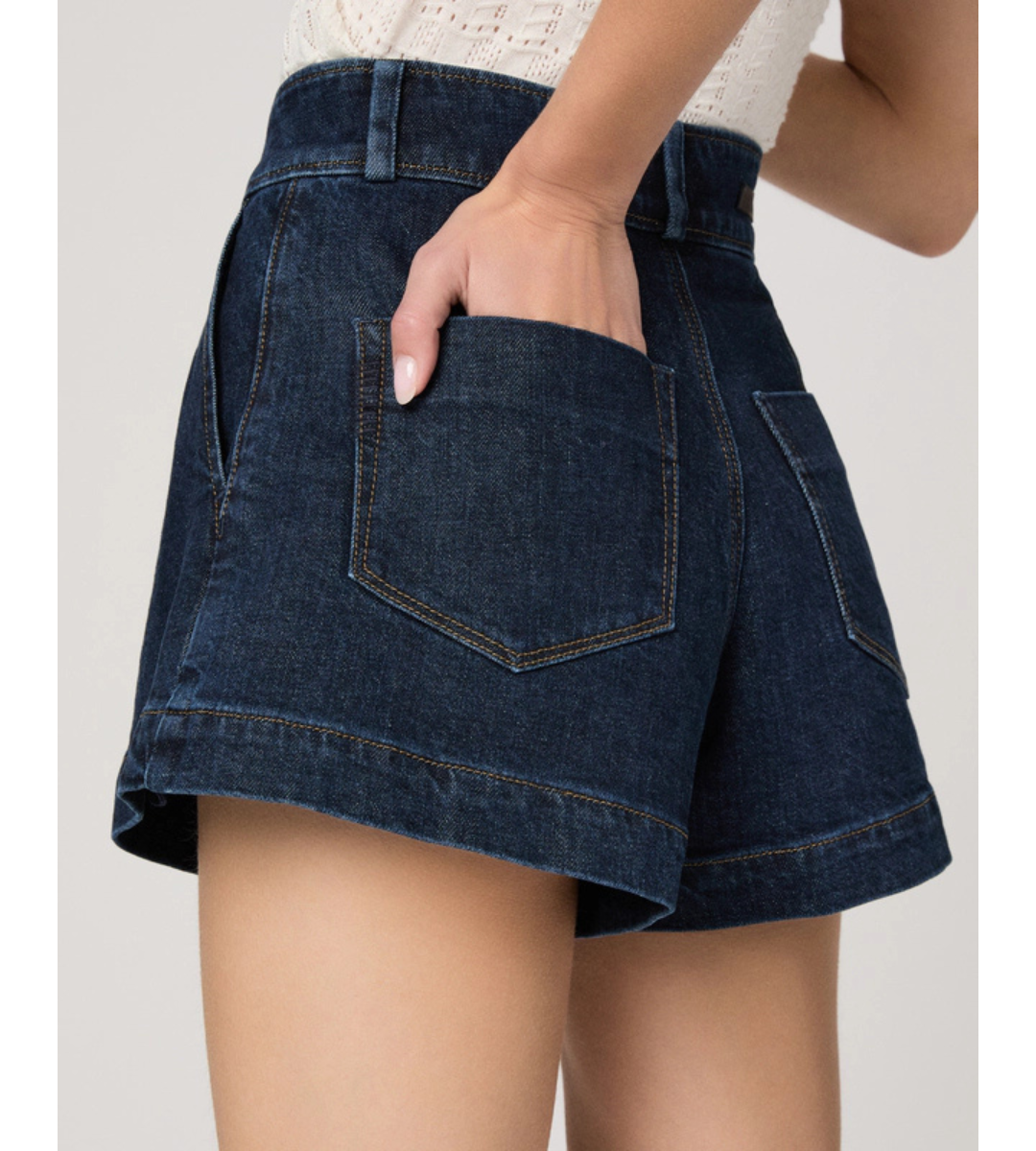 Camille is a high-rise dressed up denim short with a 3” inseam. In an elevated dark indigo wash with a self-covered vintage gold trim button, this pair is crafted from heritage-inspired denim with a soft hand-feel and a hint of stretch.