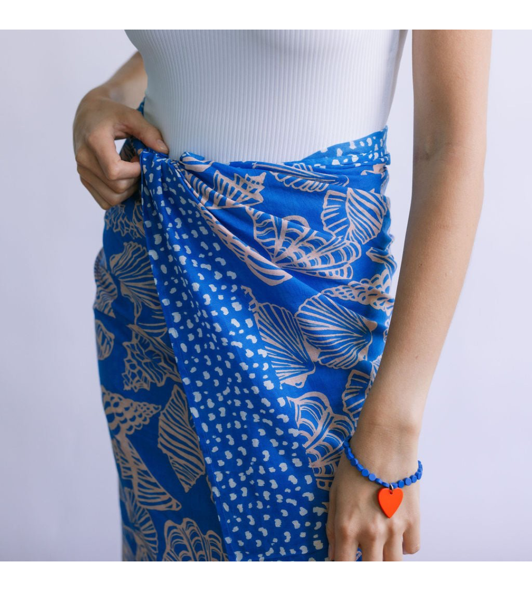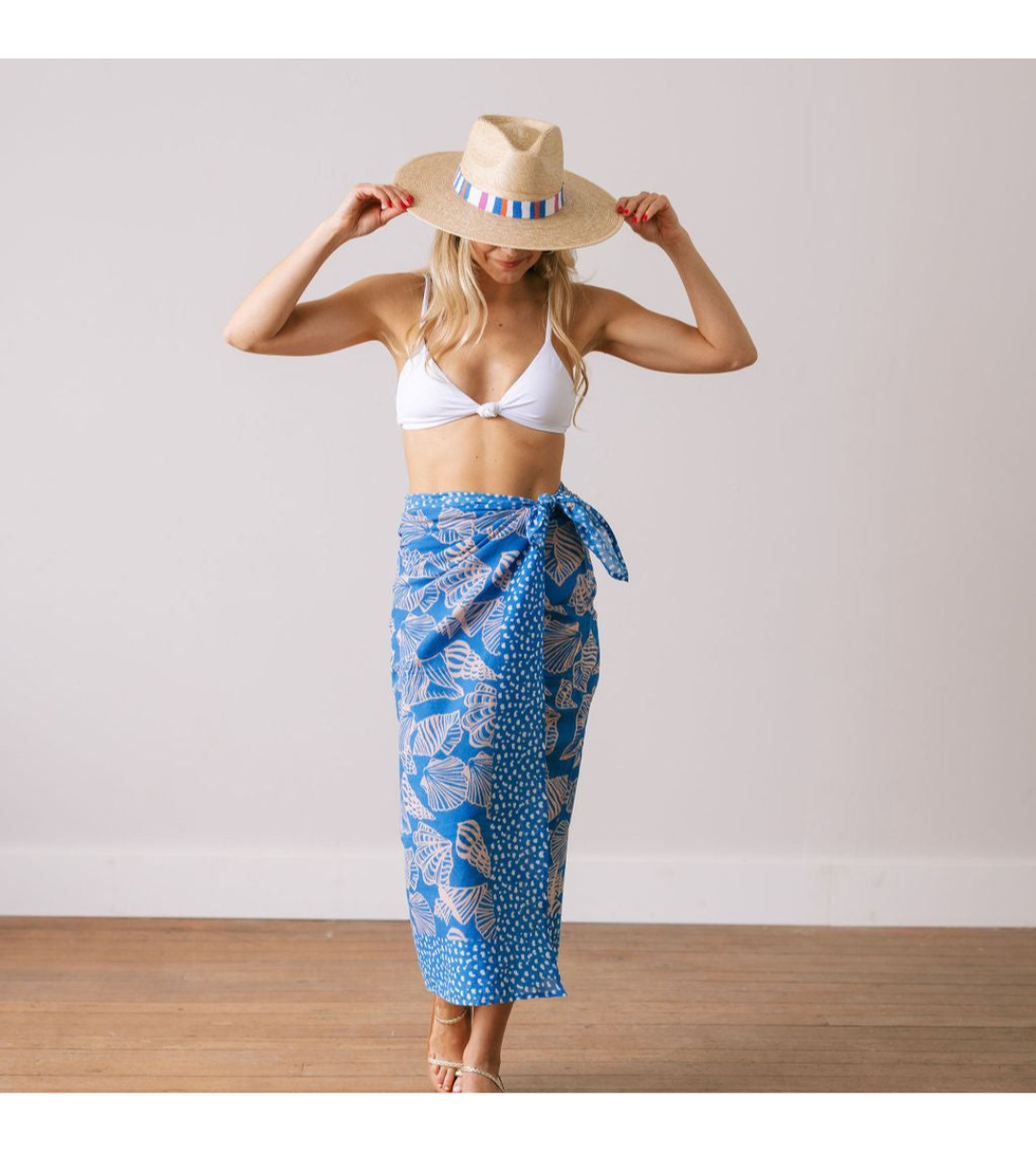 Make waves with the Mermaid Sarong — a breezy wrap skirt that captures the essence of ocean escapes. With an ocean-blue base and delicate seashell-inspired prints, this sarong ties effortlessly at the waist and adds a splash of seaside charm to any swim look. A dotted trim adds playful contrast to this coastal staple.