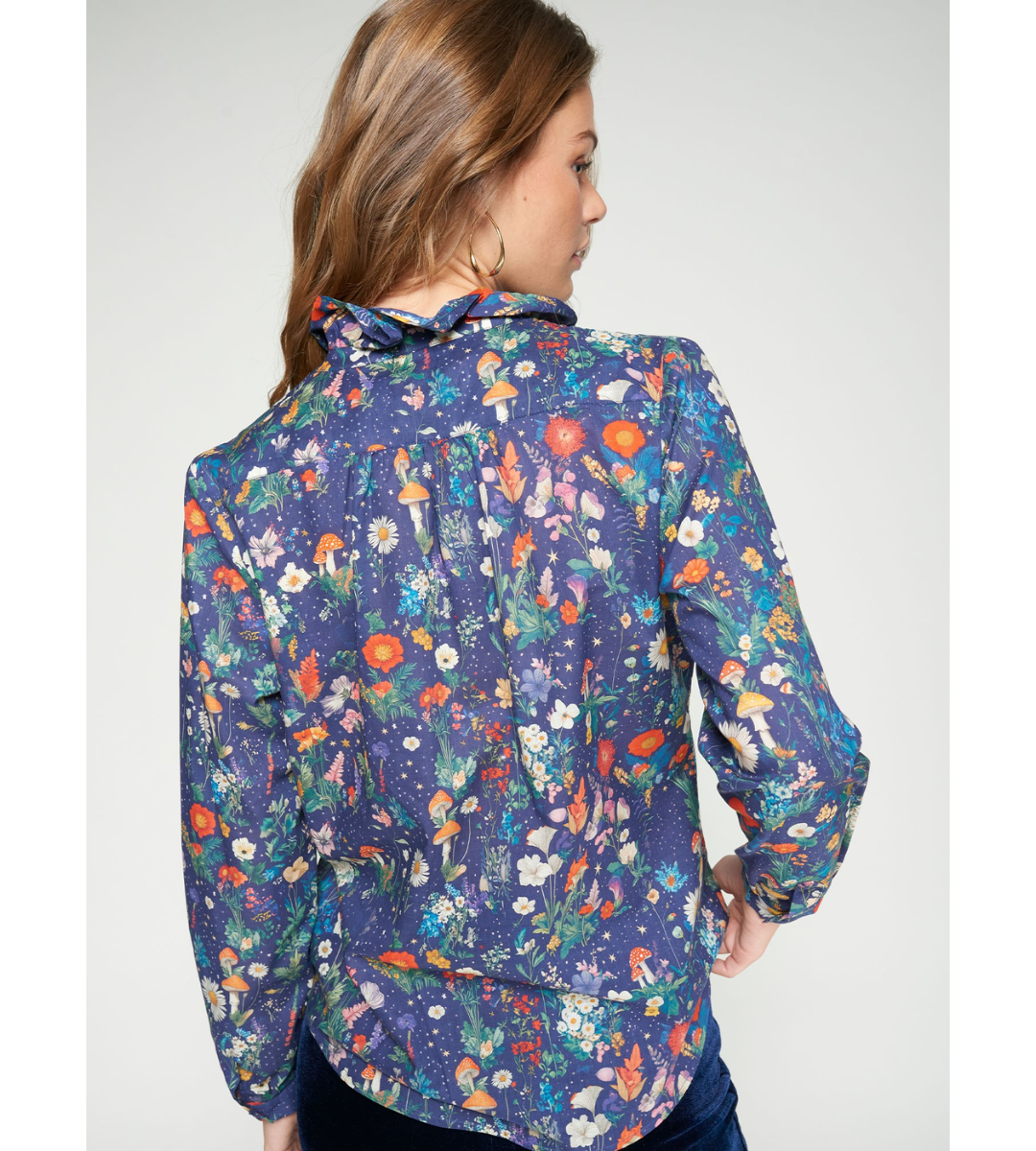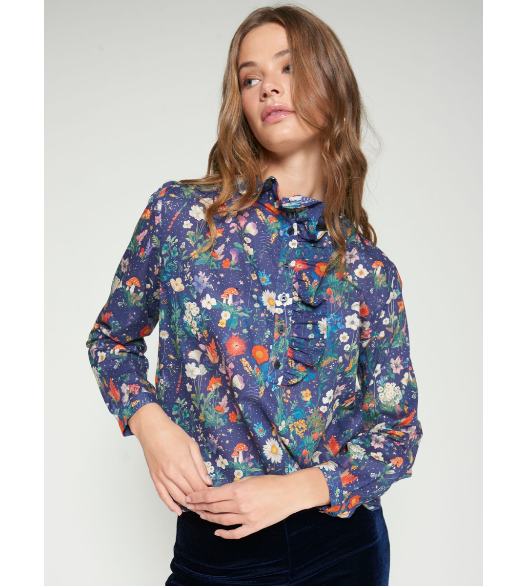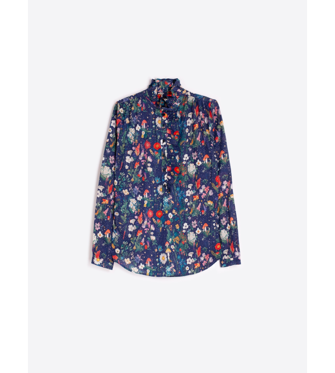 Blue blouse with multicolor floral print. High ruffled collar. Front button placket finished with a ruffle. Long sleeves with buttoned cuffs. Straight hem. Lightweight voile fabric in 100% cotton, soft and breathable.